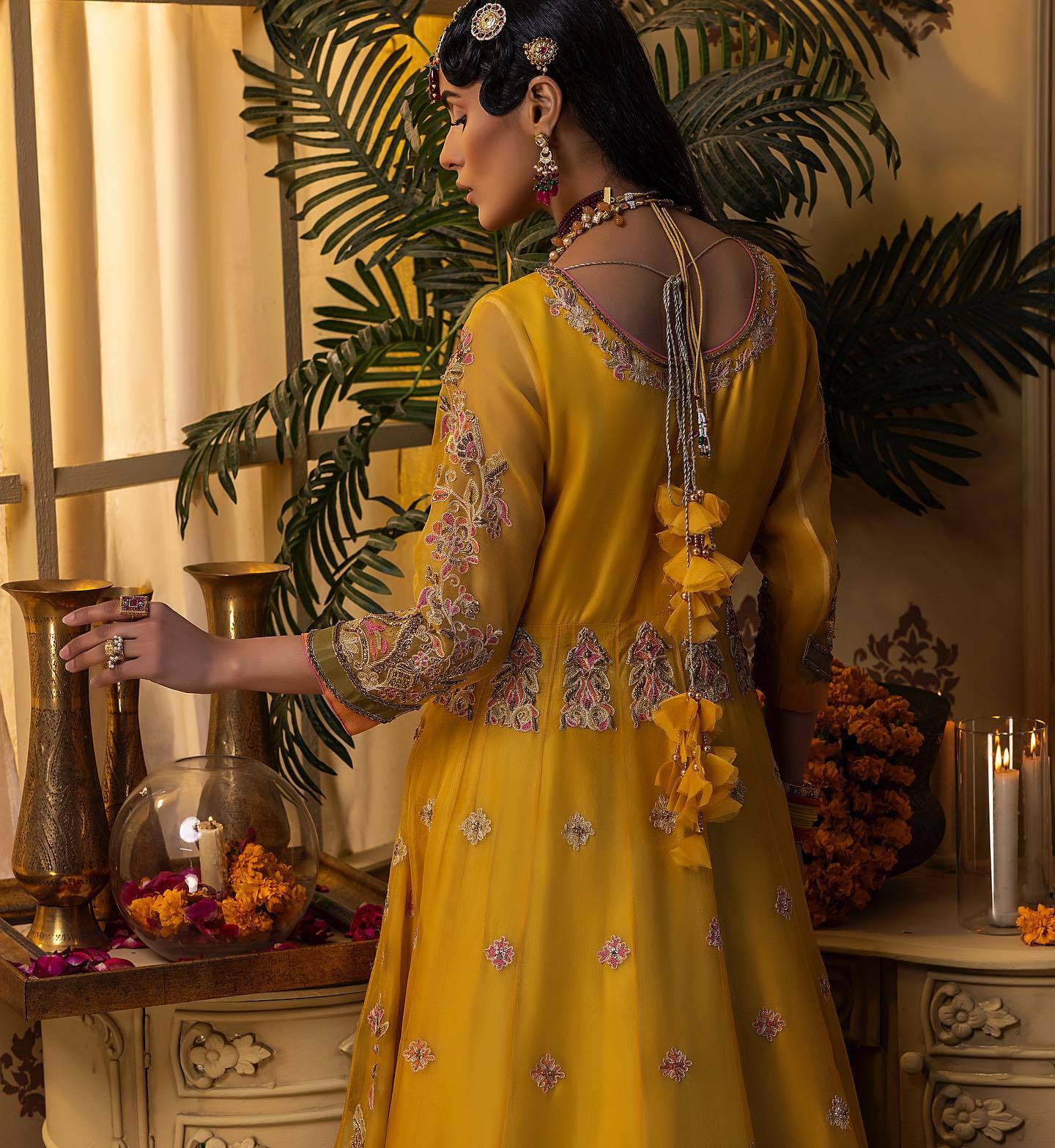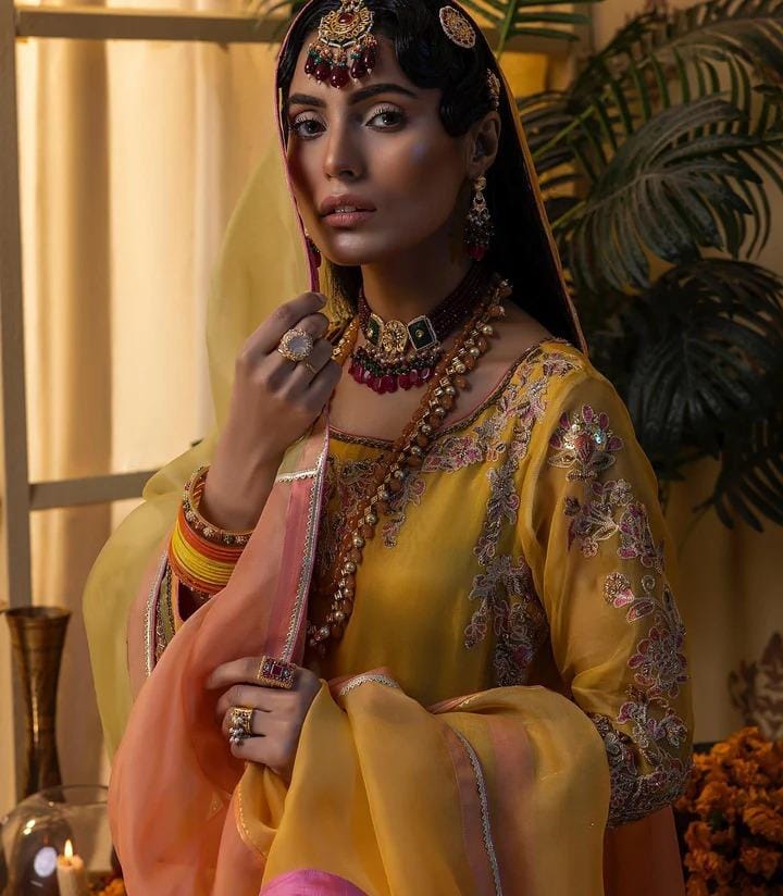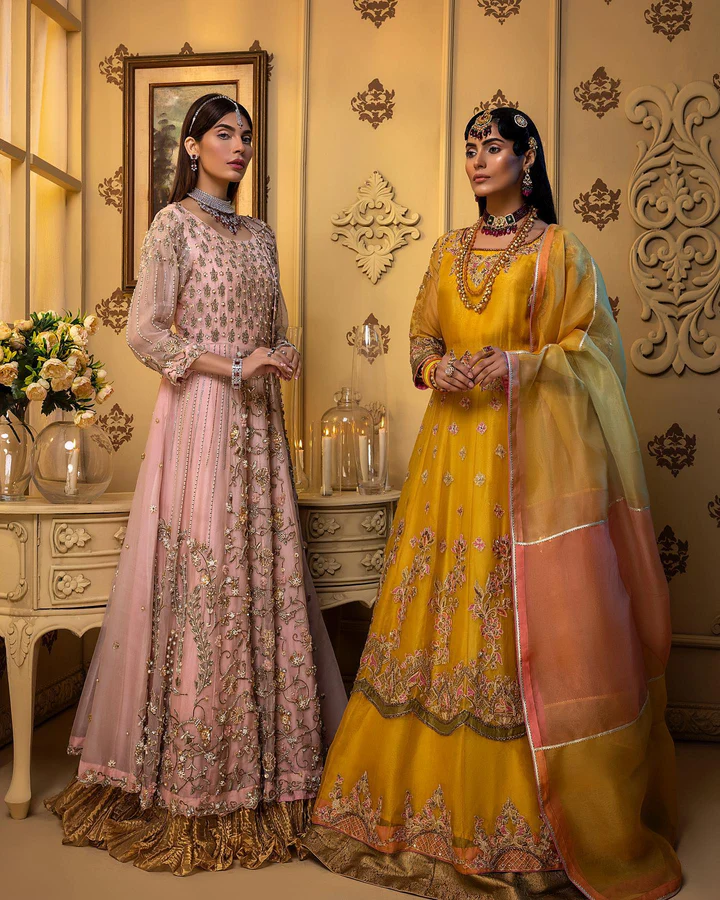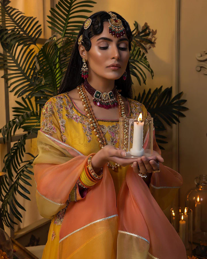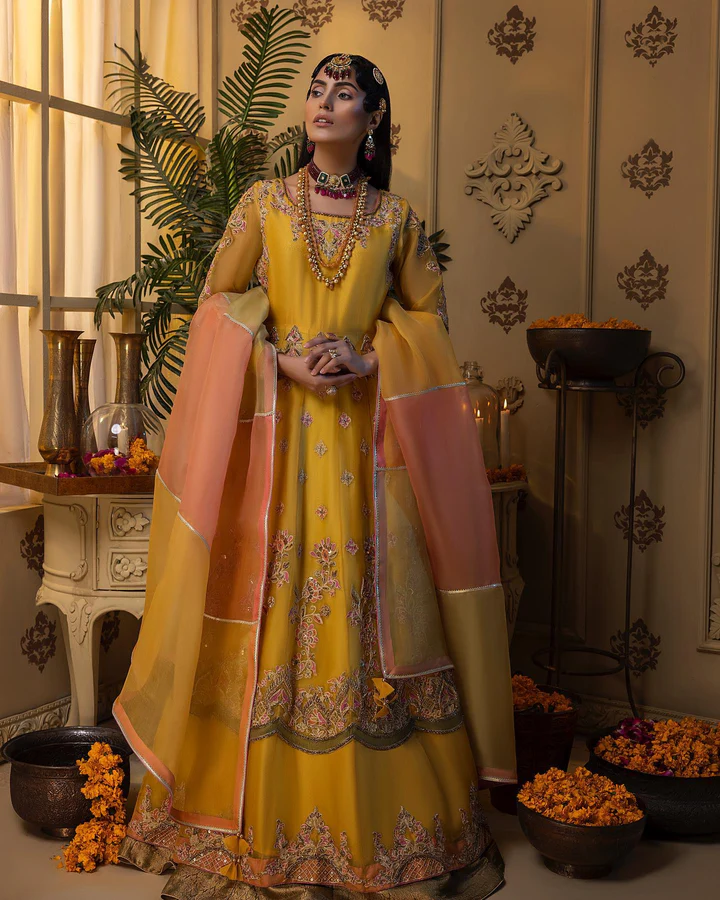 The Pishwas is designed in a breathtaking yellow shade, tailored from luxurious organza and adorned with exquisite hand embellishments. Intricate dabka, kora, resham, and embroidery flow beautifully across the garment, creating a look rich in tradition and artistry. Zardosi and sitara details add a sparkling dimension, while delicate floral handwork provides a refined, graceful finish. This Pishwas is crafted to make the bride stand out with unmatched charm at her Mehndi celebration.