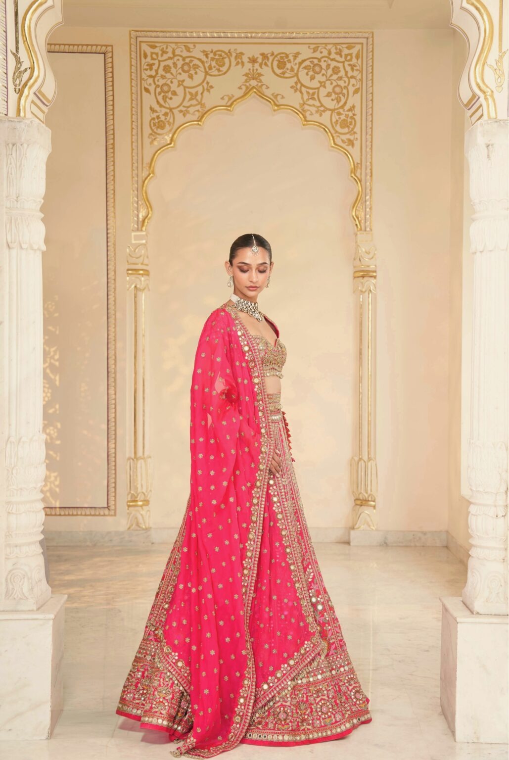 Rani Pink Beige Gold Mirror Bridal Lehenga Ensemble