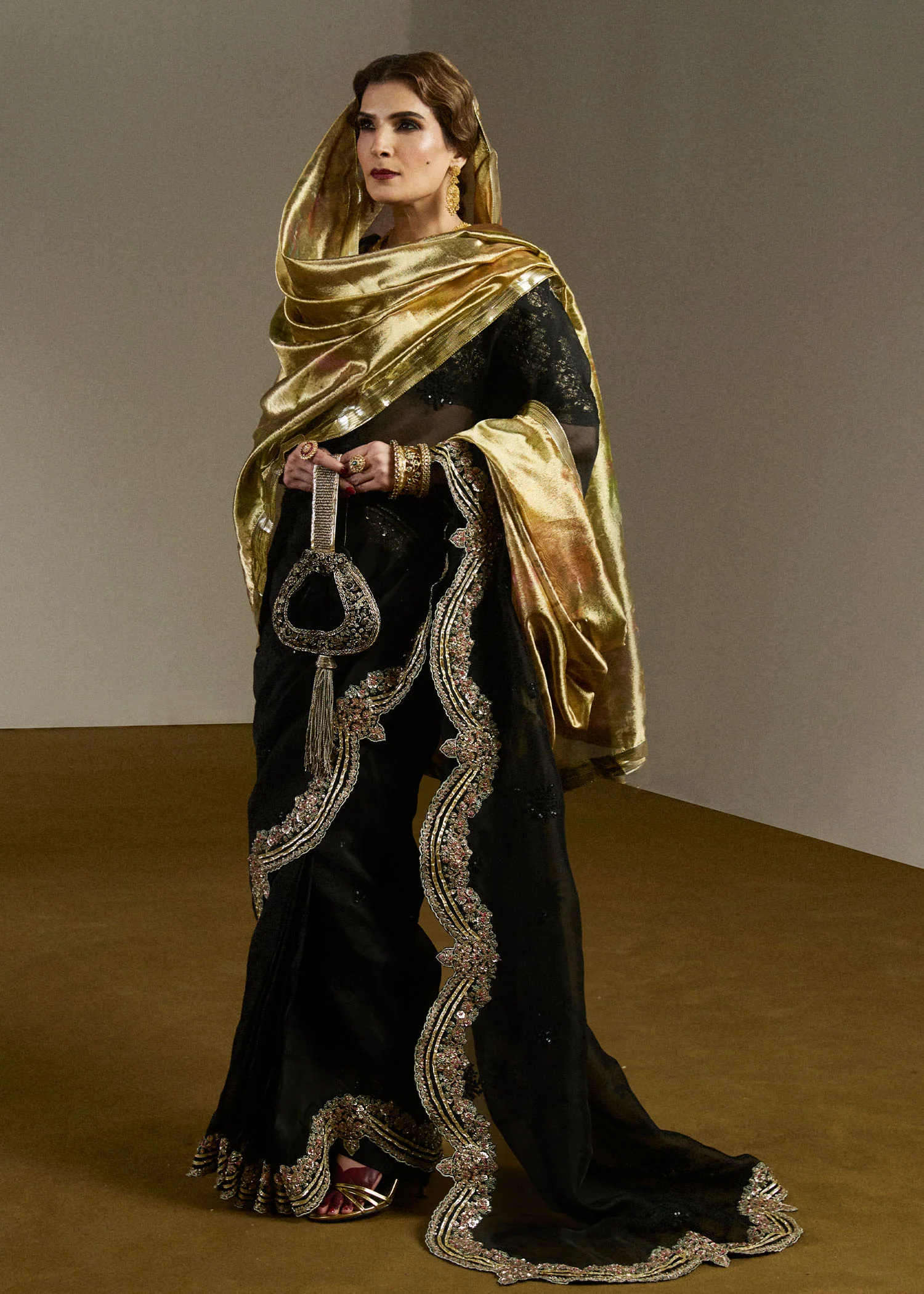 The saree is crafted in a deep raven black tone and designed to drape effortlessly with grace and fluidity. Exquisite hand embellished scalloped detailing runs along the edges, adding a subtle yet striking touch of sophistication that enhances its timeless appeal.