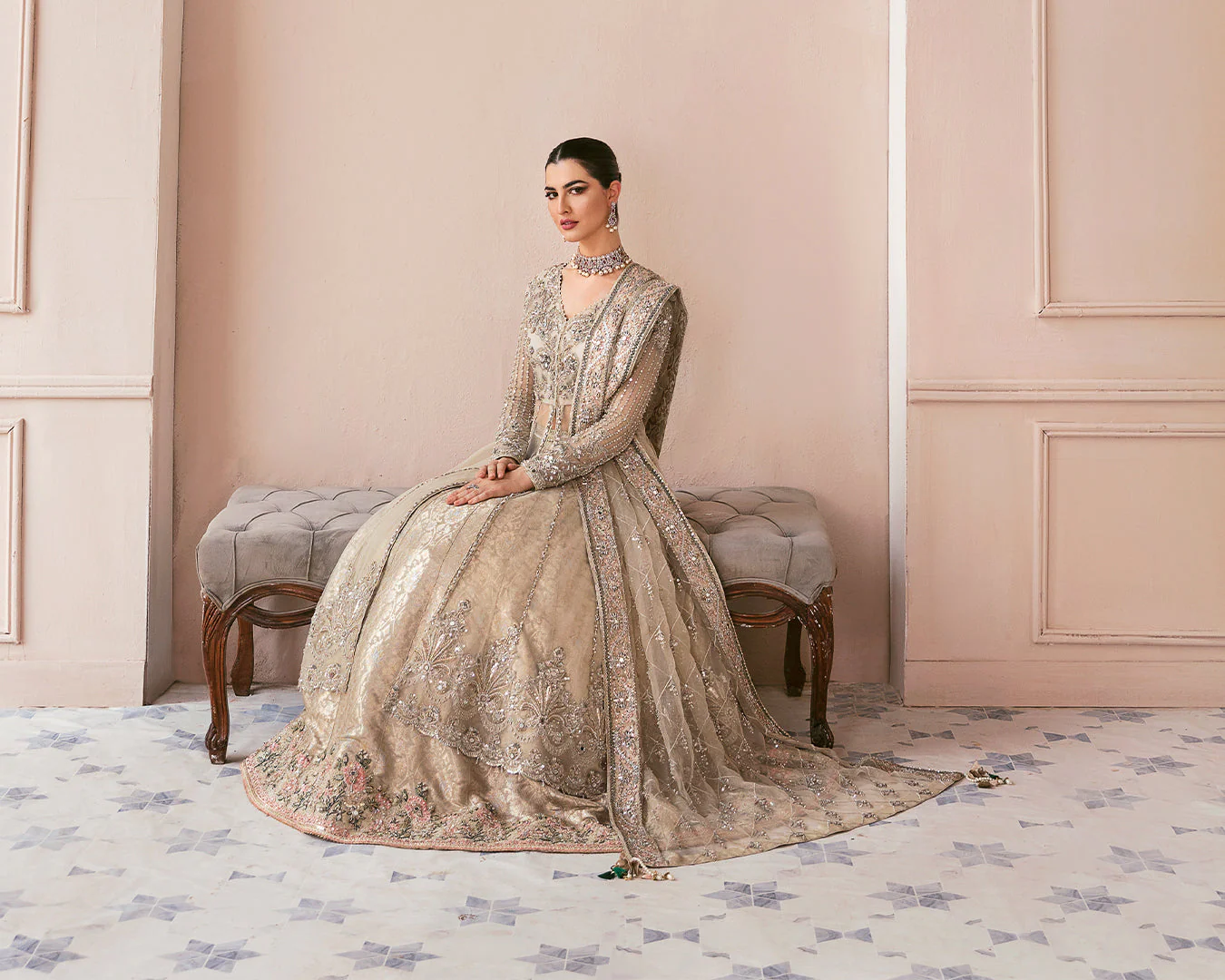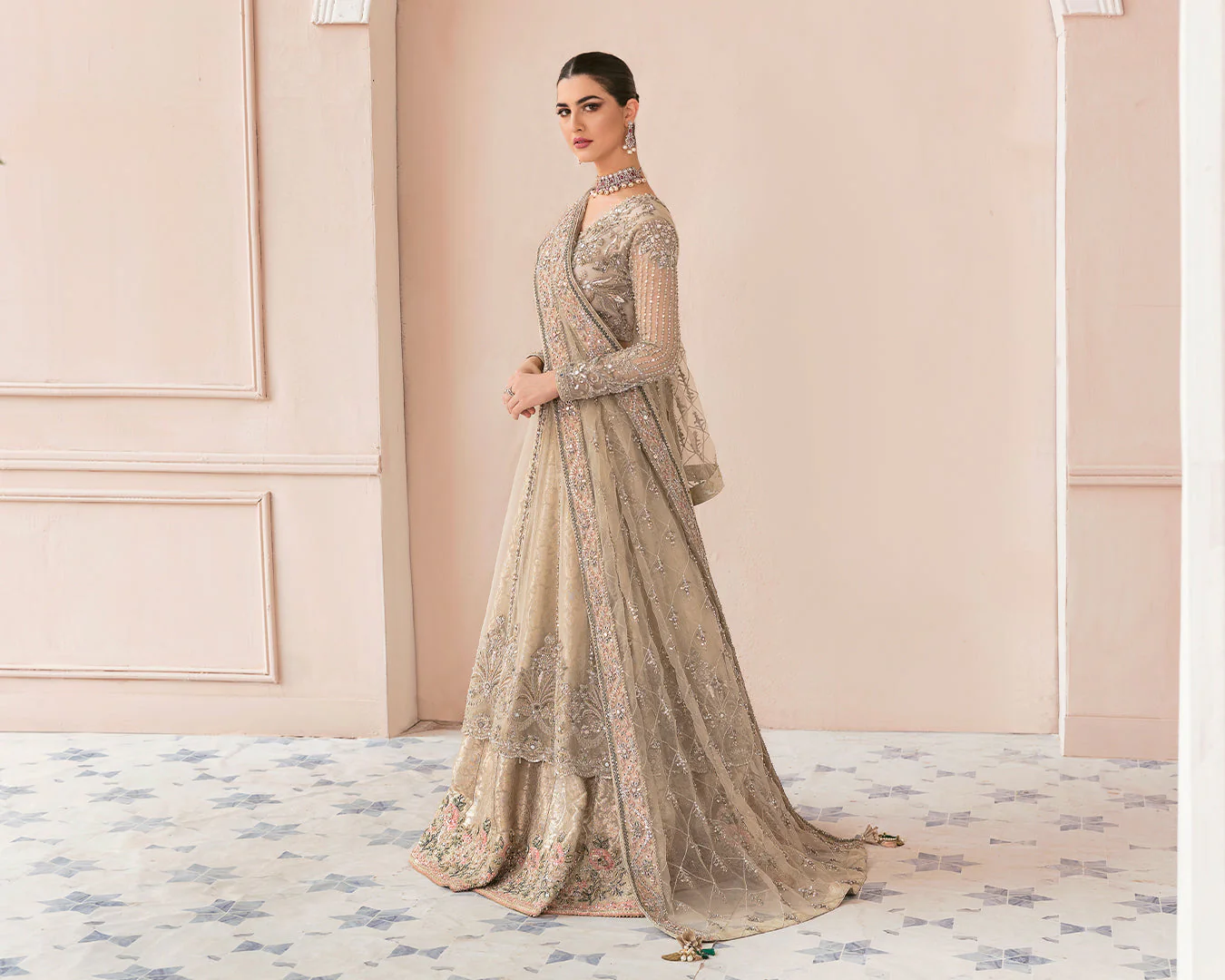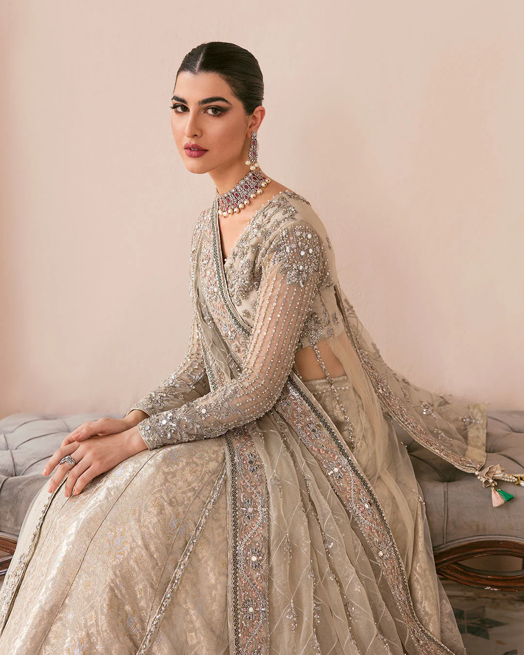An opulent Pakistani bridal ensemble featuring a premium net pishwas gown, intricately embellished with silverwork, pearls, and stones, paired with a flared Jamawar lehenga and a delicately adorned net dupatta for a regal bridal look.