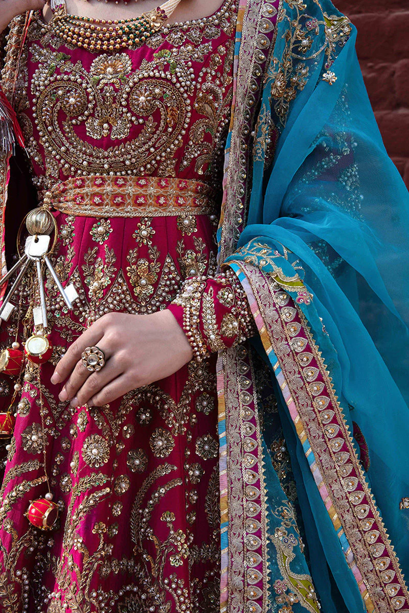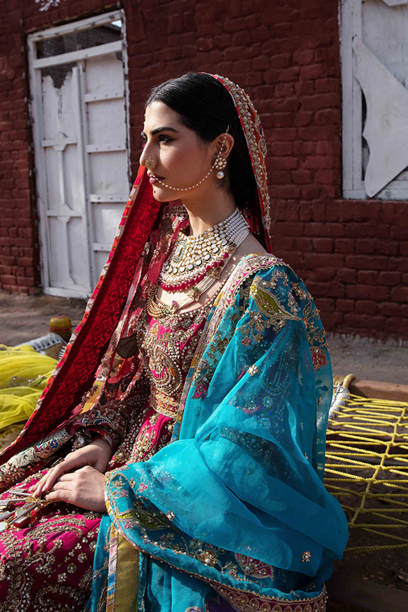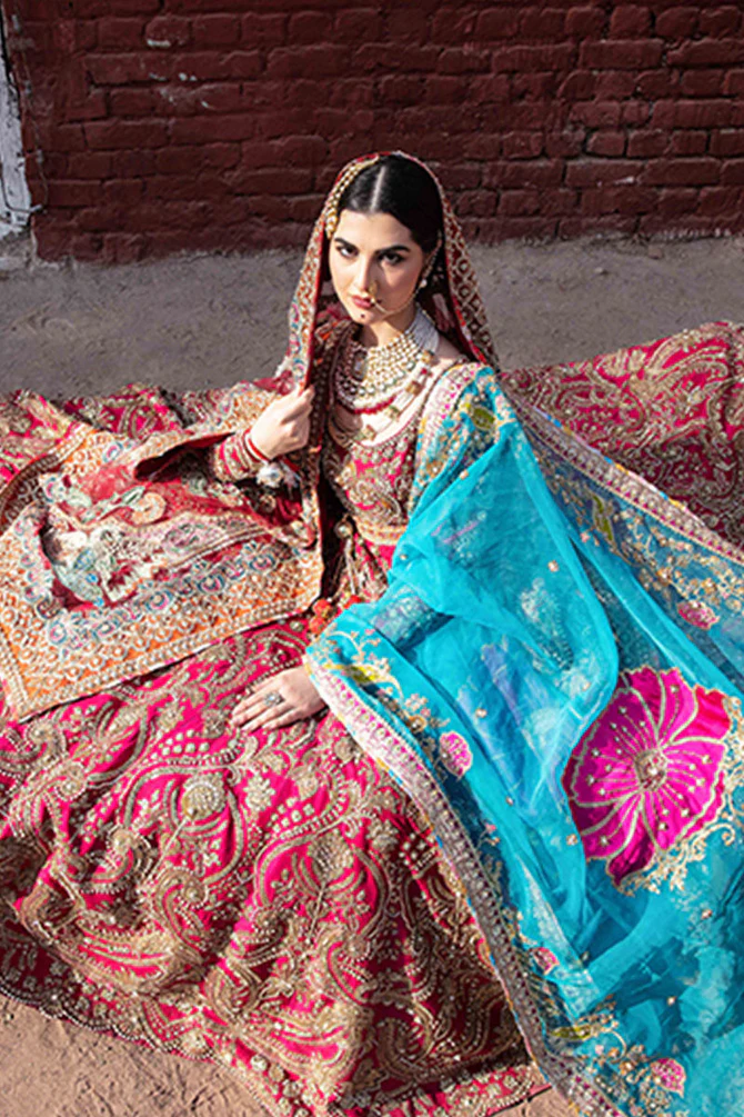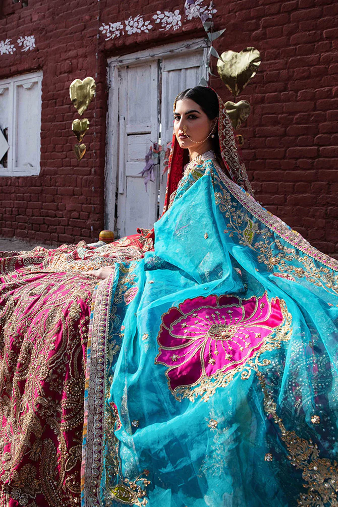 The red organza dupatta showcases Alina Ashfaq’s signature aari work, featuring delicate fruit and bird motifs for a distinctive touch. Its borders in orange and cyan are enriched with pearls, sequins, stones, and naqshi, completing an exquisite accessory for the lehenga. The cyan organza dupatta offers a striking contrast with heavy embellishments, including aari work, appliqué, zardozi, pearls, crystals, and sequins. This statement piece adds a layered, opulent look to the bridal ensemble, perfect for a royal wedding appearance.