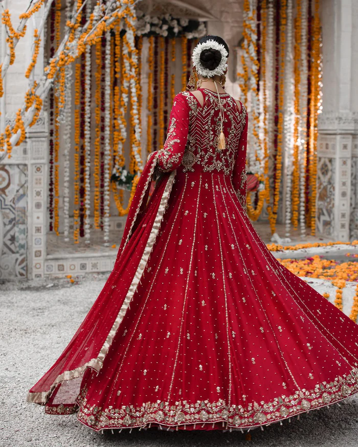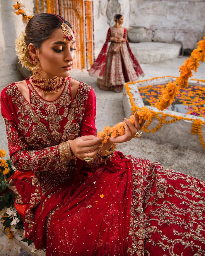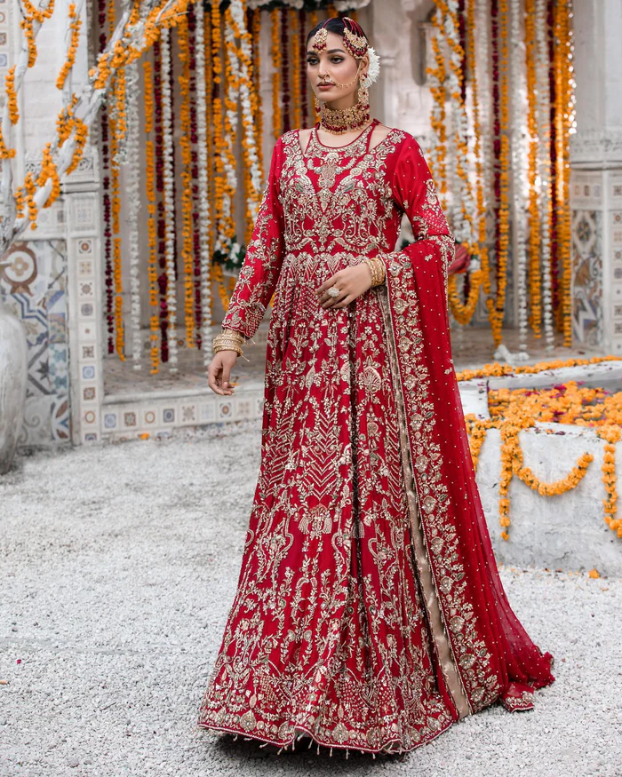 The vibrant red palette, enhanced with golden embroidery and pearl accents, exudes regal sophistication and bridal elegance.
