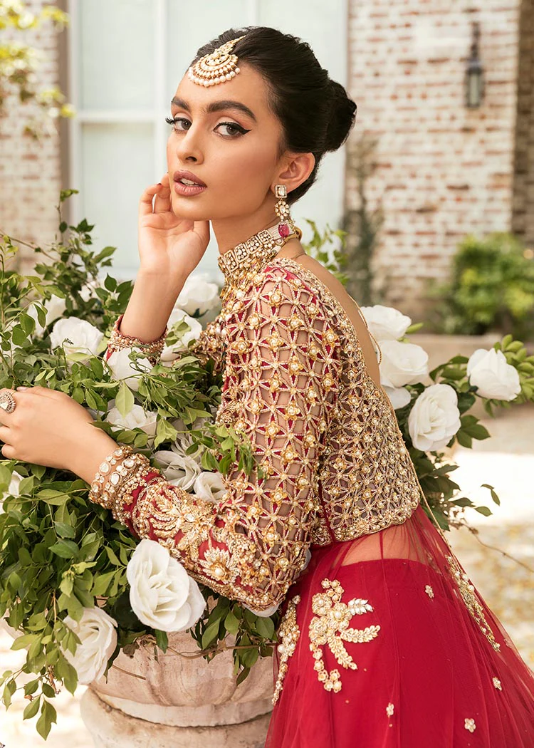 The red net dupatta carries a scalloped border worked by hand to match the gown’s detailing. Light embellishment across the fabric softens the look while keeping the focus on the beautifully crafted peshwas and lehnga.
