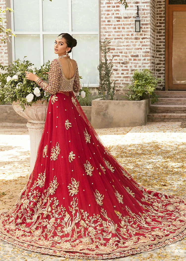 The peshwas is crafted in rich red net, featuring hand-placed floral motifs that rise elegantly along the gown and continue across the flowing train. The bodice and sleeves carry a striking geometric pattern, enhanced with refined cutwork that adds depth and texture. The inner lining provides comfort while maintaining the gown’s regal structure.