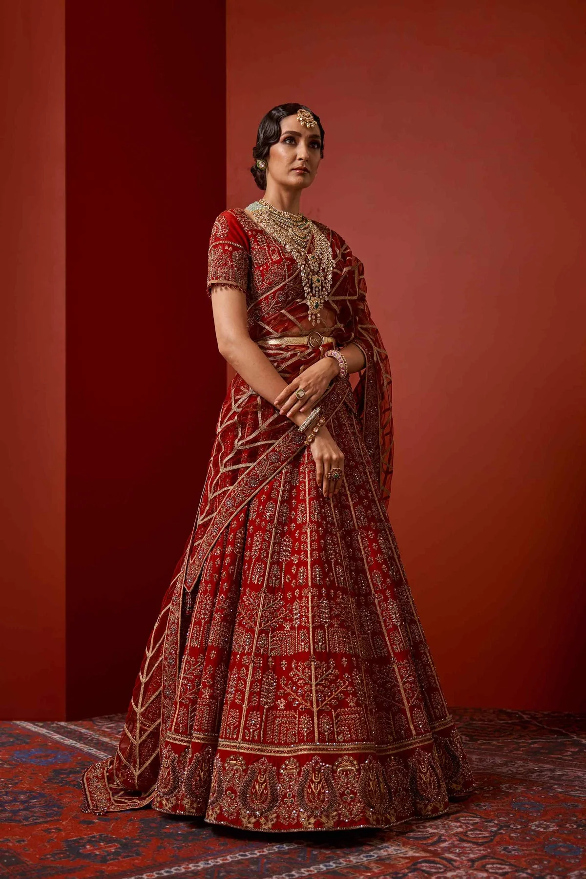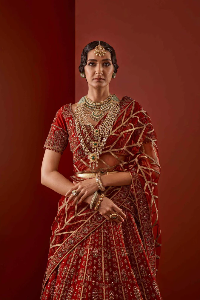 The red velvet lehenga is designed with a floor-length, asymmetrical flare that exudes grace and sophistication. Handcrafted copper embroidery and intricate needlework adorn the lehenga, including delicate copper beading along the sweetheart base and thread patterns. The combination of simplicity and exquisite craftsmanship transforms this lehenga into a stunning bridal statement.