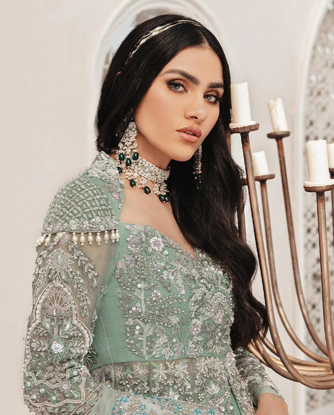 Make your wedding day unforgettable with this majestic blue front open gown Lehenga. Featuring intricate silverwork, floral motifs, and delicate embellishments, this ensemble radiates elegance and sophistication, perfect for the modern Pakistani bride.