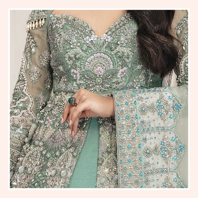 Completing the ensemble is a delicate premium organza dupatta, meticulously embellished with blue and white beads, stones, and handcrafted motifs. The beautifully adorned borders complement the gown and Lehenga, adding a final touch of elegance and refinement. Softly draped, this dupatta enhances the overall regal look of the front open gown Lehenga ensemble.