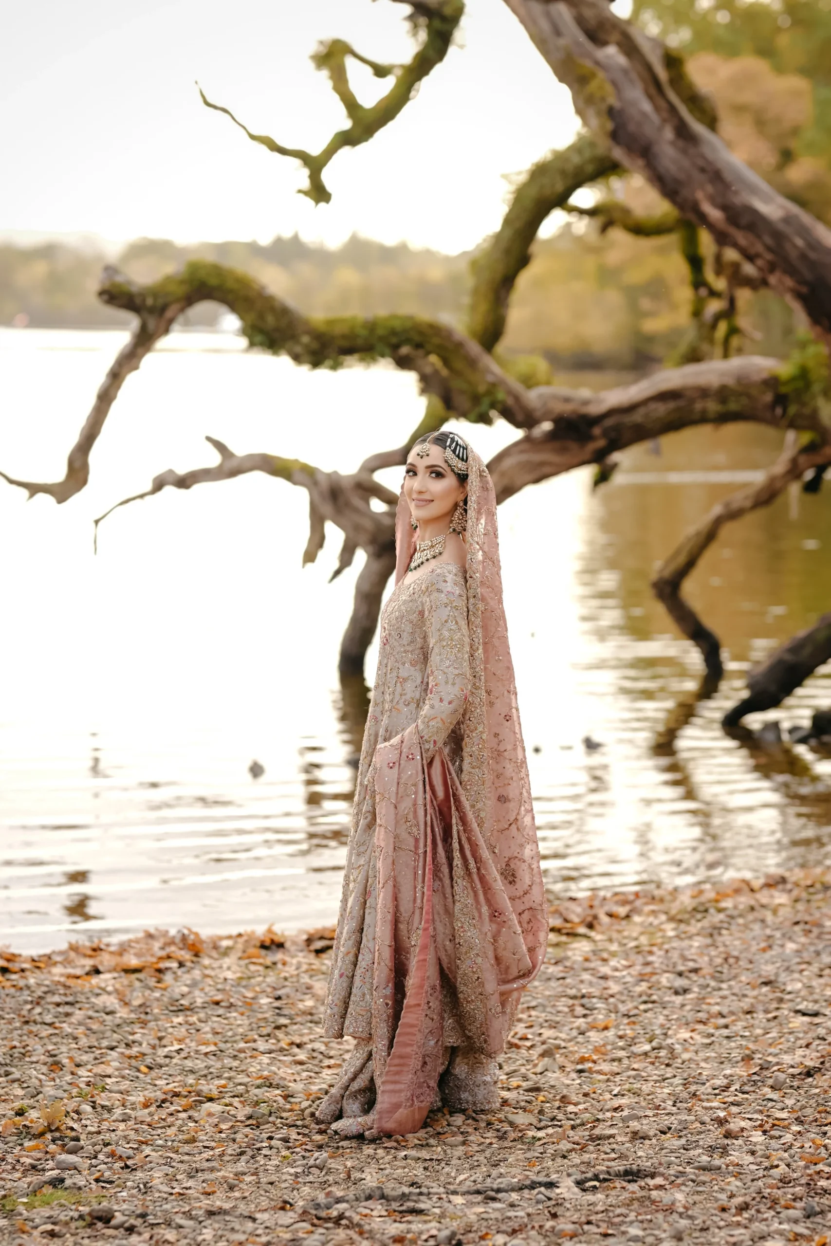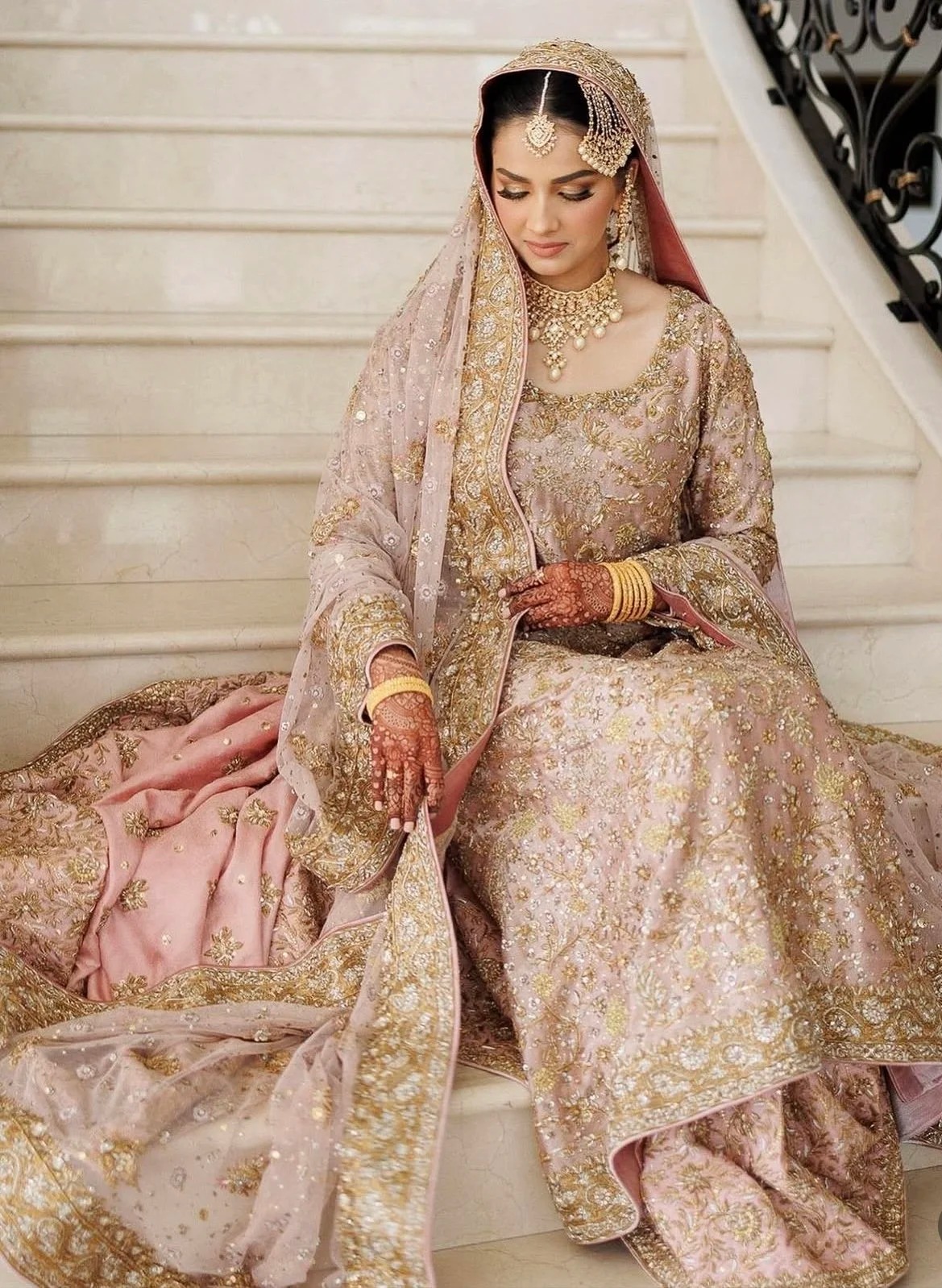 A majestic Pakistani bridal ensemble featuring a long, heavily embroidered dusty rose shirt paired with a voluminous, layered skirt/gharara in complementary blush tones, and a soft net dupatta finished with opulent gold work.