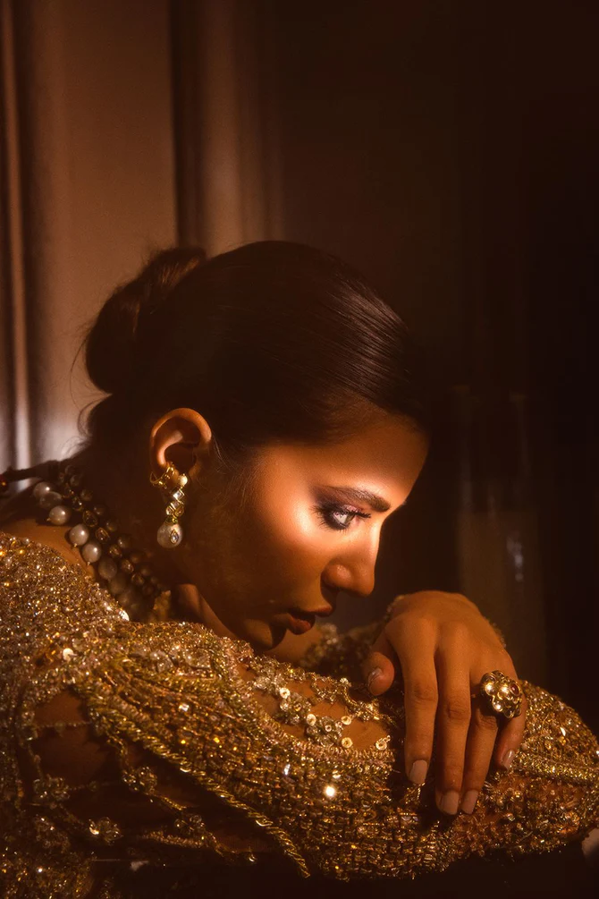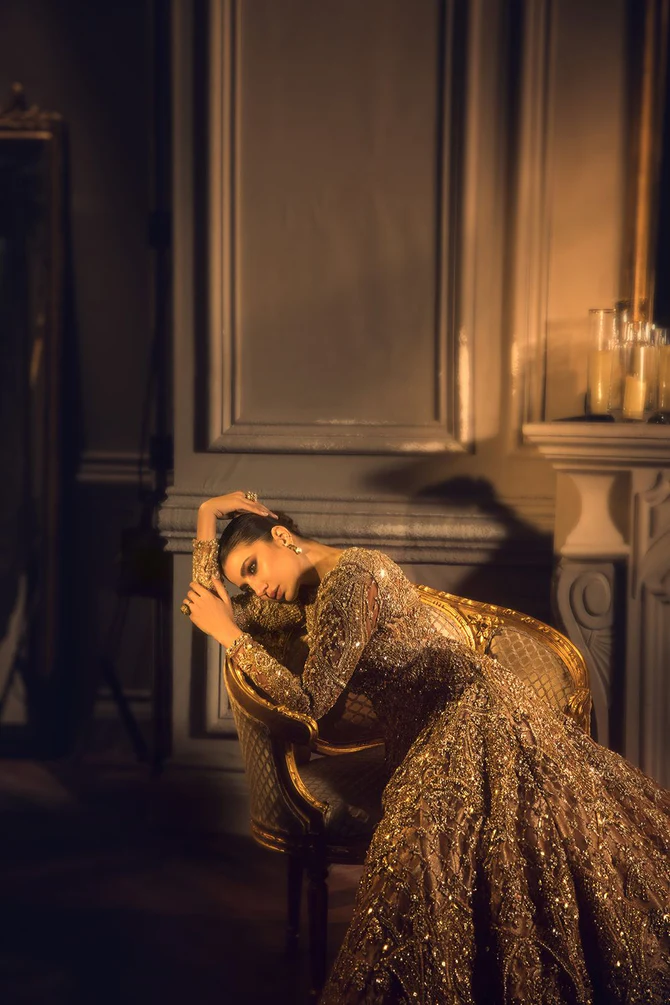 The gown’s skirt flows seamlessly from the waist, crafted with layers of net and satin for structure and comfort. The full flare adds a breathtaking volume, allowing the bride to glide gracefully. Fine handcrafted embellishments extend across the skirt, enhancing the luxurious appeal and completing the gown’s majestic silhouette.