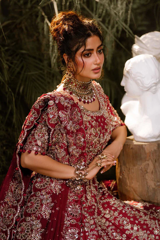 The dupatta is crafted from deep maroon chiffon, finished with heavily embellished borders featuring golden appliqué that perfectly complements the ensemble. Sequins, beads, and delicately placed motifs add a soft, radiant glow. A katan-lined edge provides subtle structure while preserving the fluid drape.