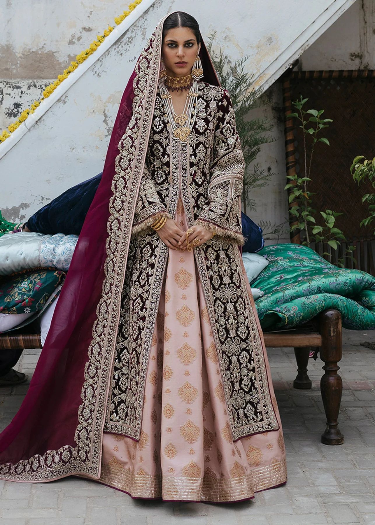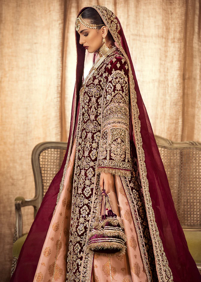 A statement Pakistani bridal outfit featuring an open gown–style top paired with a heavily embellished lehnga, crafted in rich maroon katan silk with radiant gold detailing for a majestic bridal look.