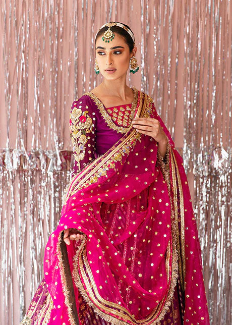 This vibrant plum bridal ensemble features a hand-embellished choli, a flowing lehenga with intricate gota, naqshi, and stone work, and a delicately crafted dupatta. Perfect for Mehndi or wedding celebrations, it exudes traditional charm with a modern, glamorous appeal.