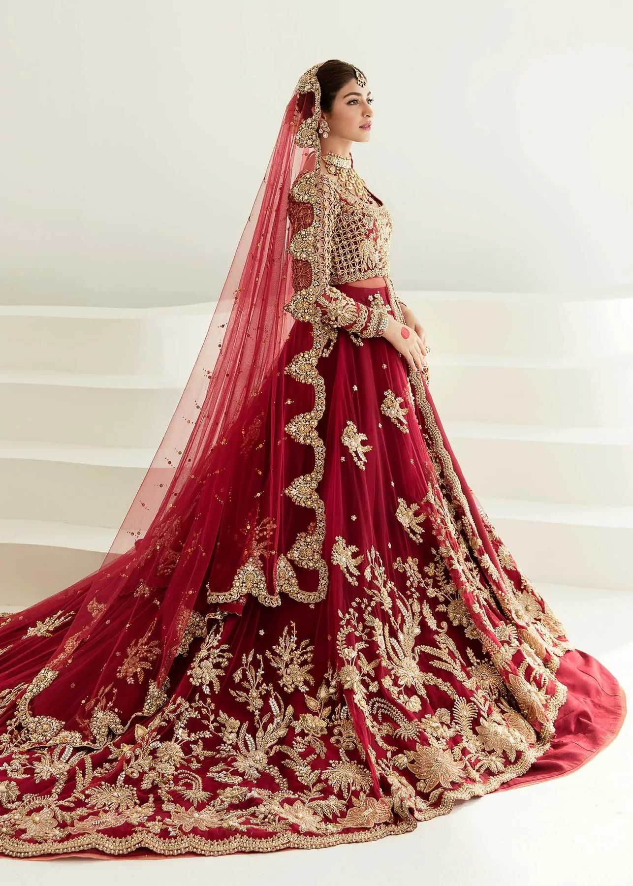 A breathtaking Pakistani bridal ensemble in vibrant red, featuring a Gown Lehenga design adorned with intricate resham, dabka, kora, marori, and tilla work. The pure French net gown paired with a heavily embellished mesori lehenga and a delicately crafted chiffon dupatta creates an opulent, royal look perfect for brides seeking elegance and tradition.