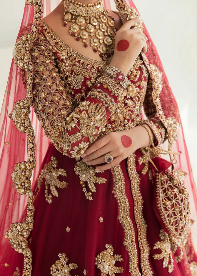 The top is a floor-length gown crafted from premium French net fabric in a striking red hue. It features a front-open design with intricate resham, dabka, kora, marori, and tilla embroidery in strawberry shades, adding a luxurious and regal touch. Aari work jaal patterns enhance the texture, while heavily embellished borders provide a grand finishing to the gown. The combination of delicate craftsmanship and royal color ensures an enchanting bridal look.