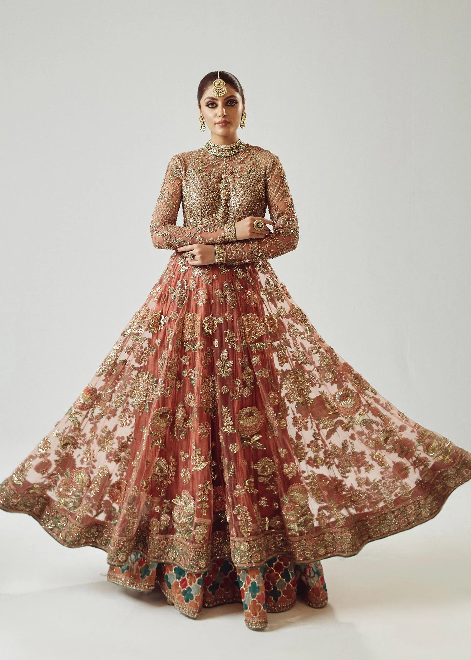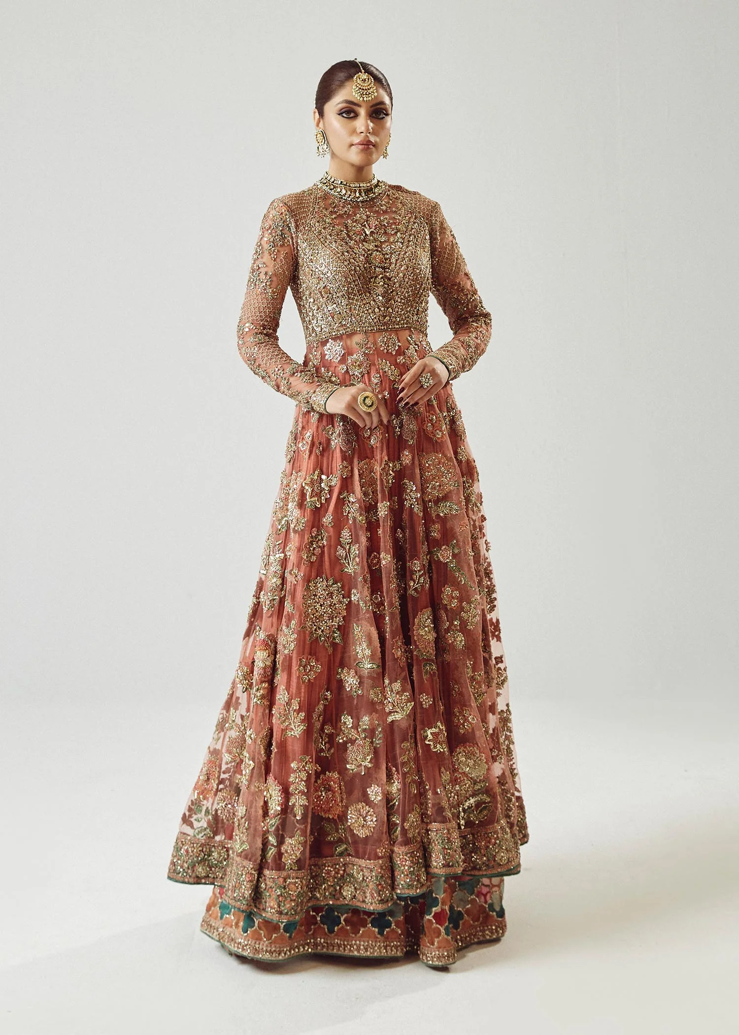 The peshwas is tailored from premium net fabric in a stunning rose gold shade. Detailed reham embroidery, enhanced with delicate adda work, embellishes the neckline, bodice, and hem, creating a regal and elegant appeal. A soft inner lining ensures comfort, while the flowing structure allows graceful movement.