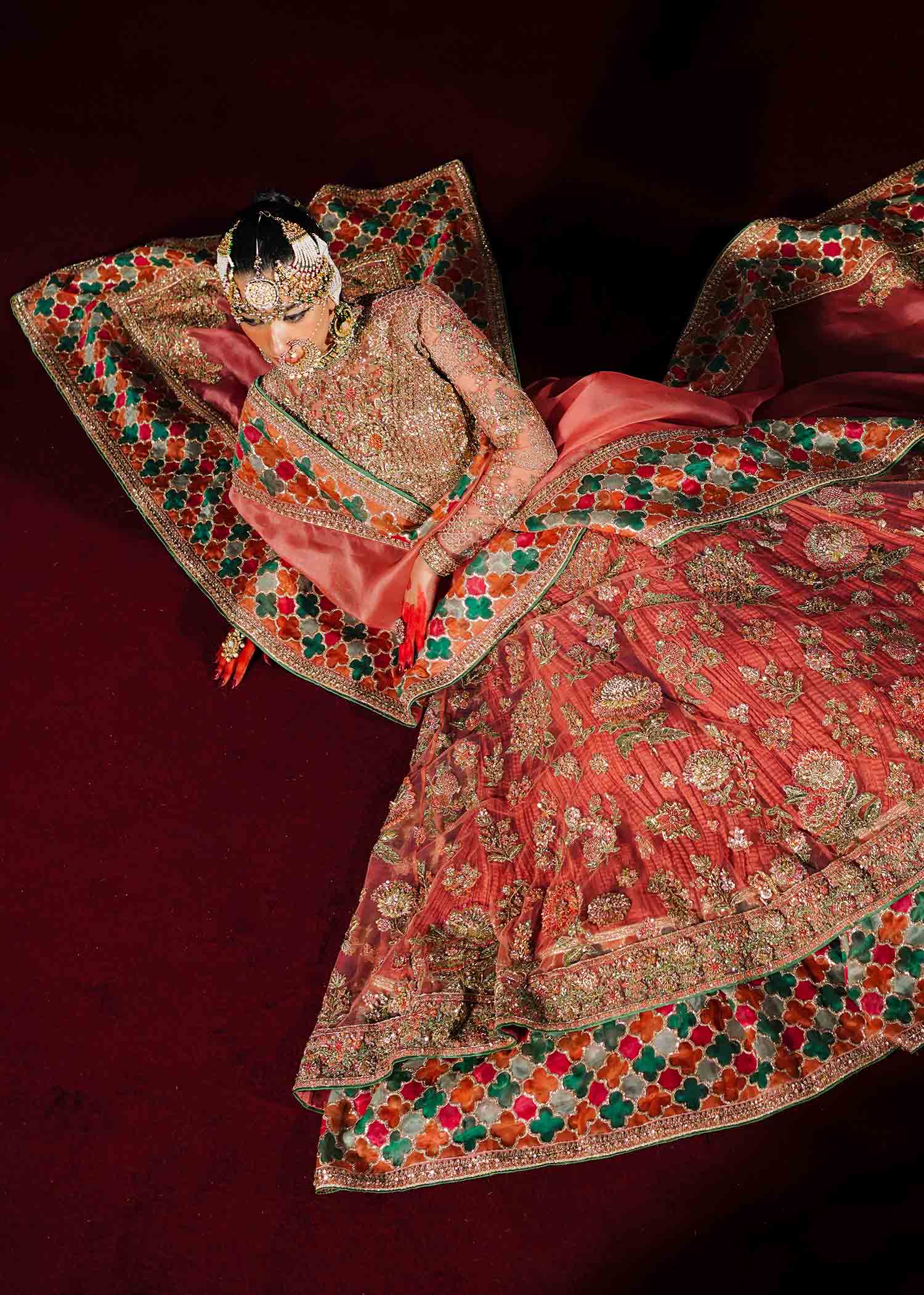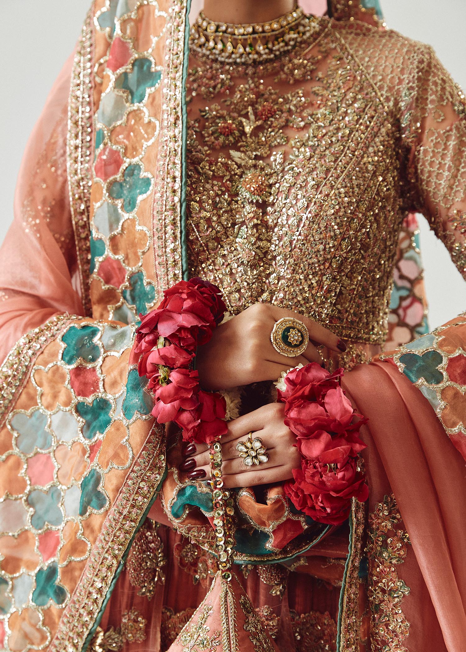 Handcrafted reham embroidery with intricate adda work and organza chatapati border detailing. Natural variations reflect authentic handwork.