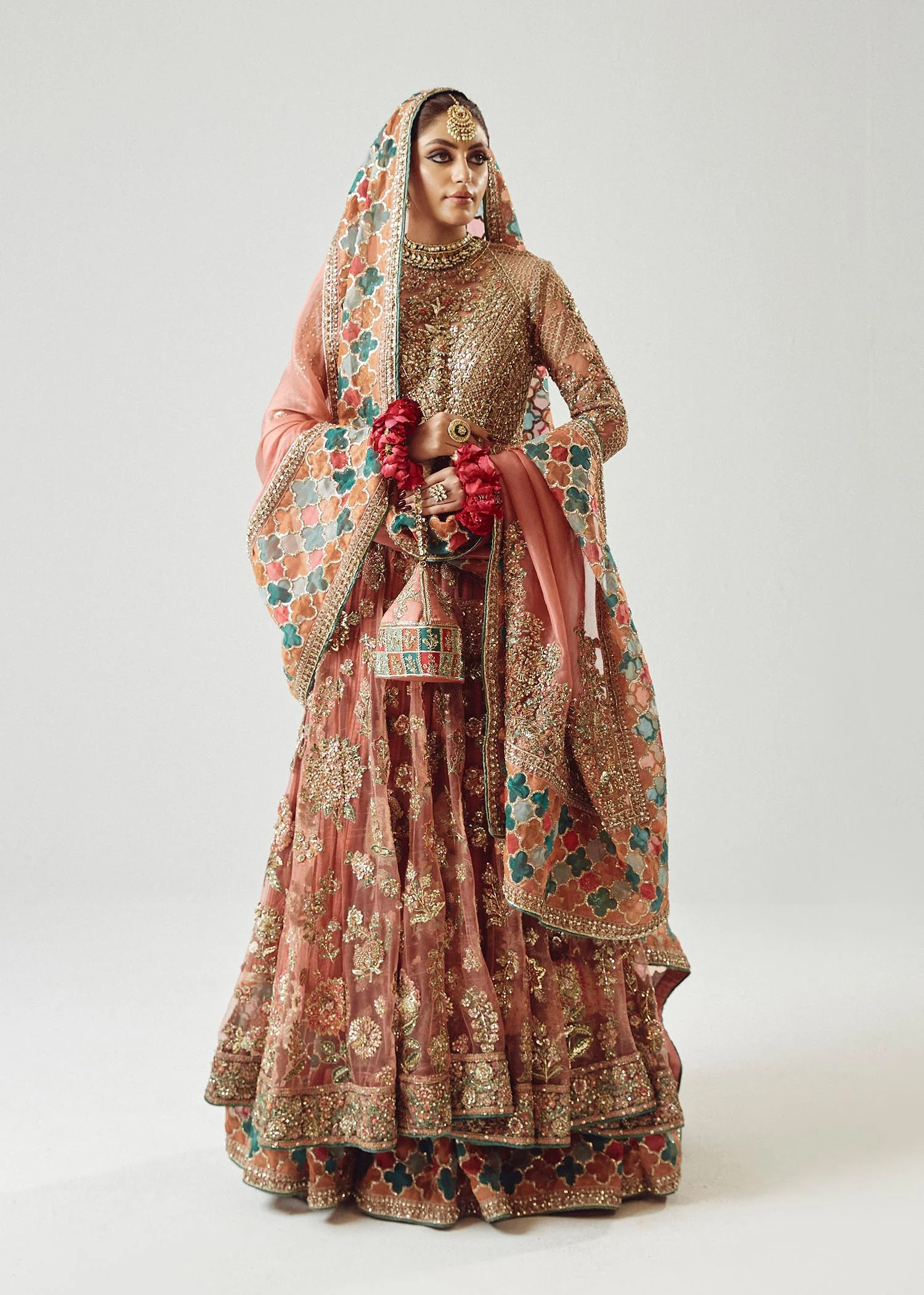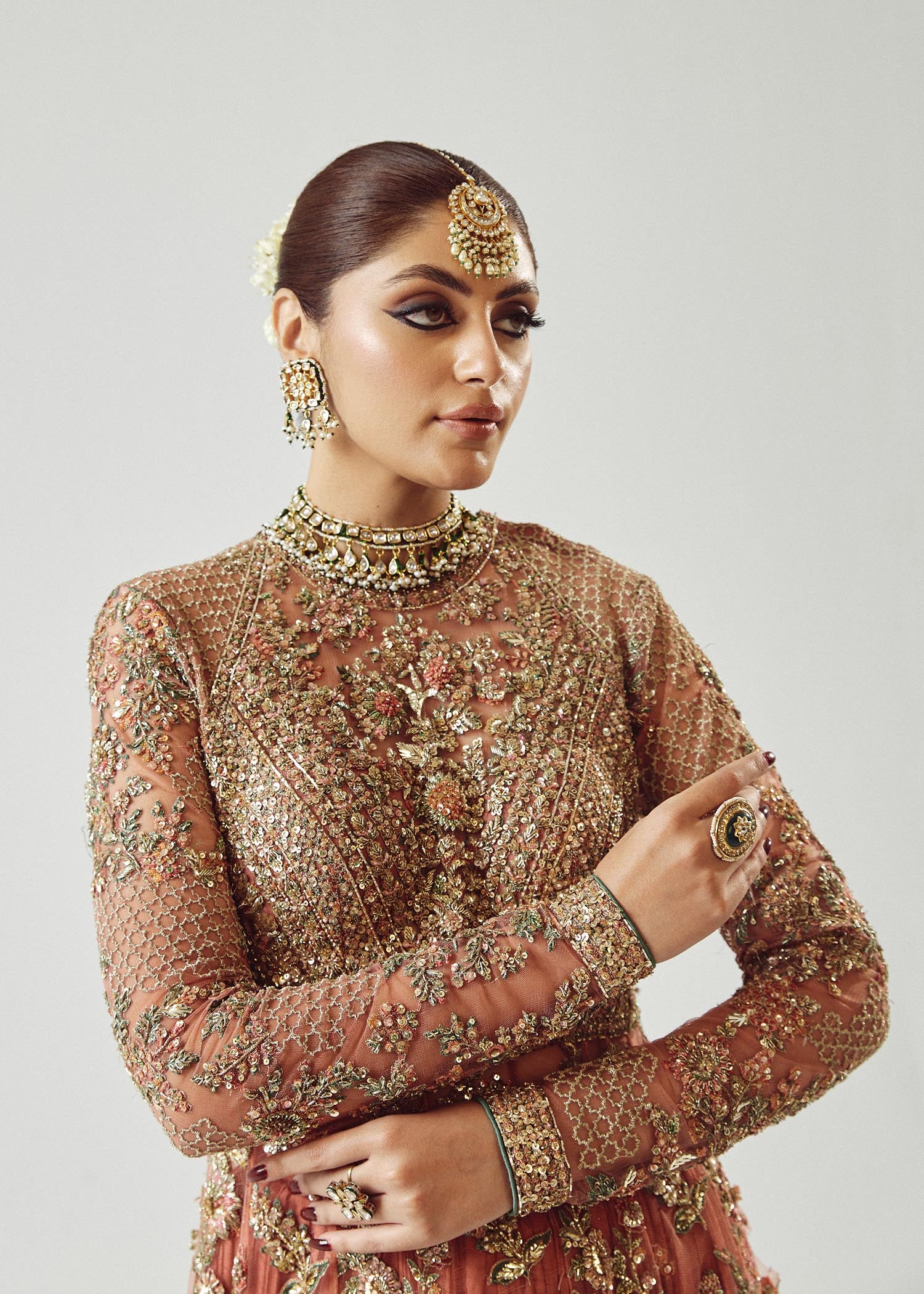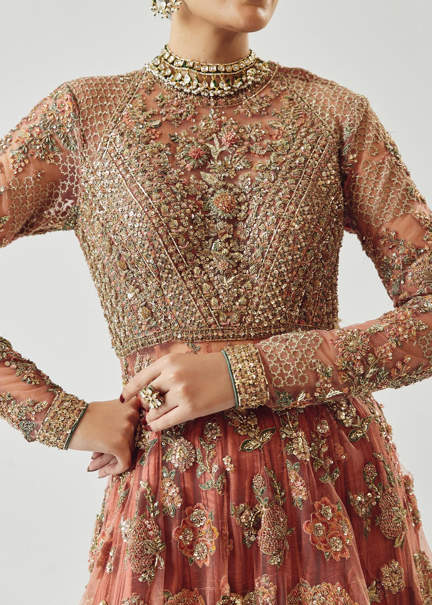 An elegant rose gold net peshwas ensemble paired with a medium silk crushed sharara and an organza dupatta, adorned with intricate hand embroidery and detailed borders for a refined and sophisticated look.