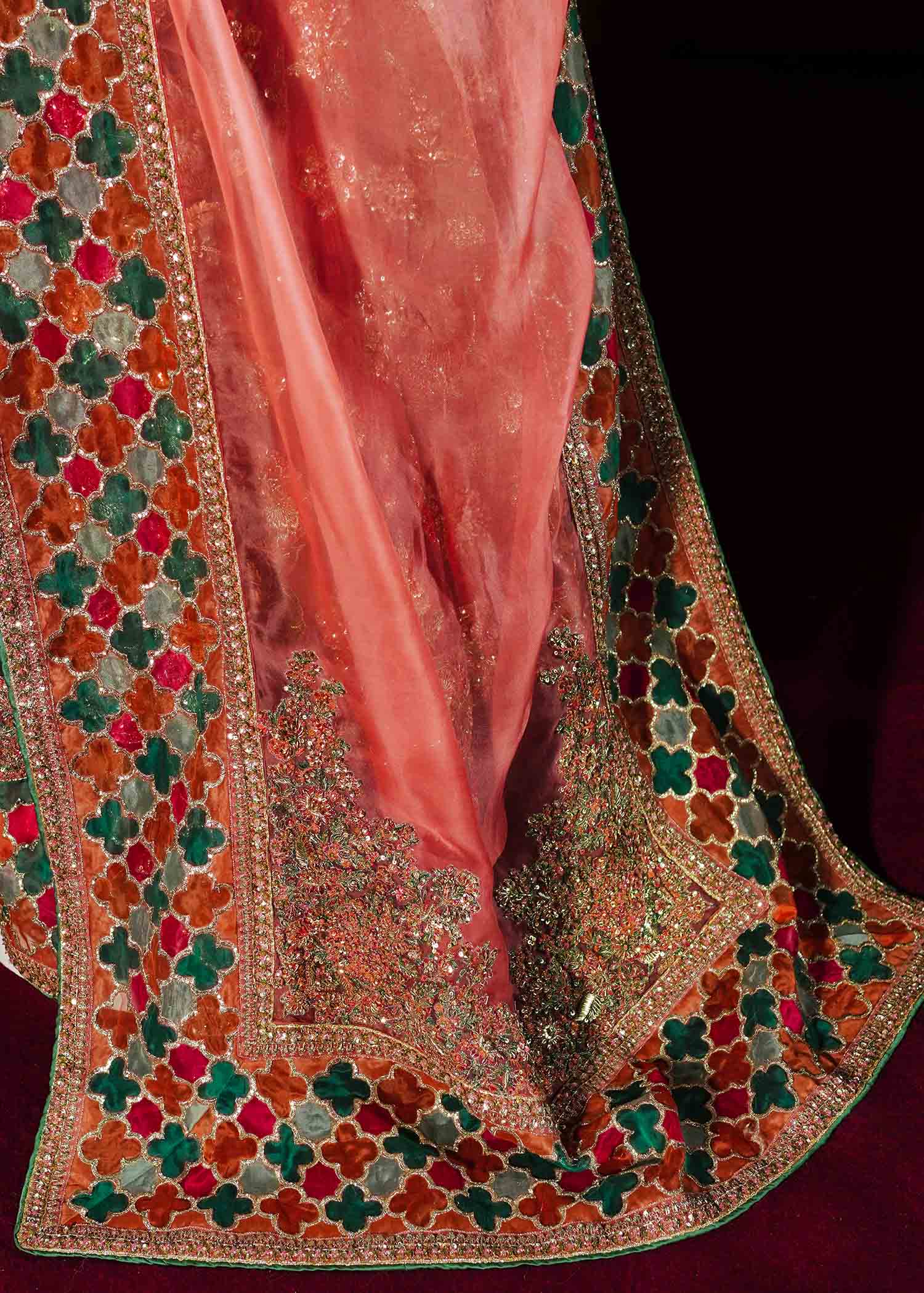 The organza dupatta is adorned with exquisite adda work and finished with organza chatapati borders on all four sides. The delicate detailing adds ethereal charm and completes the ensemble with a refined drape.