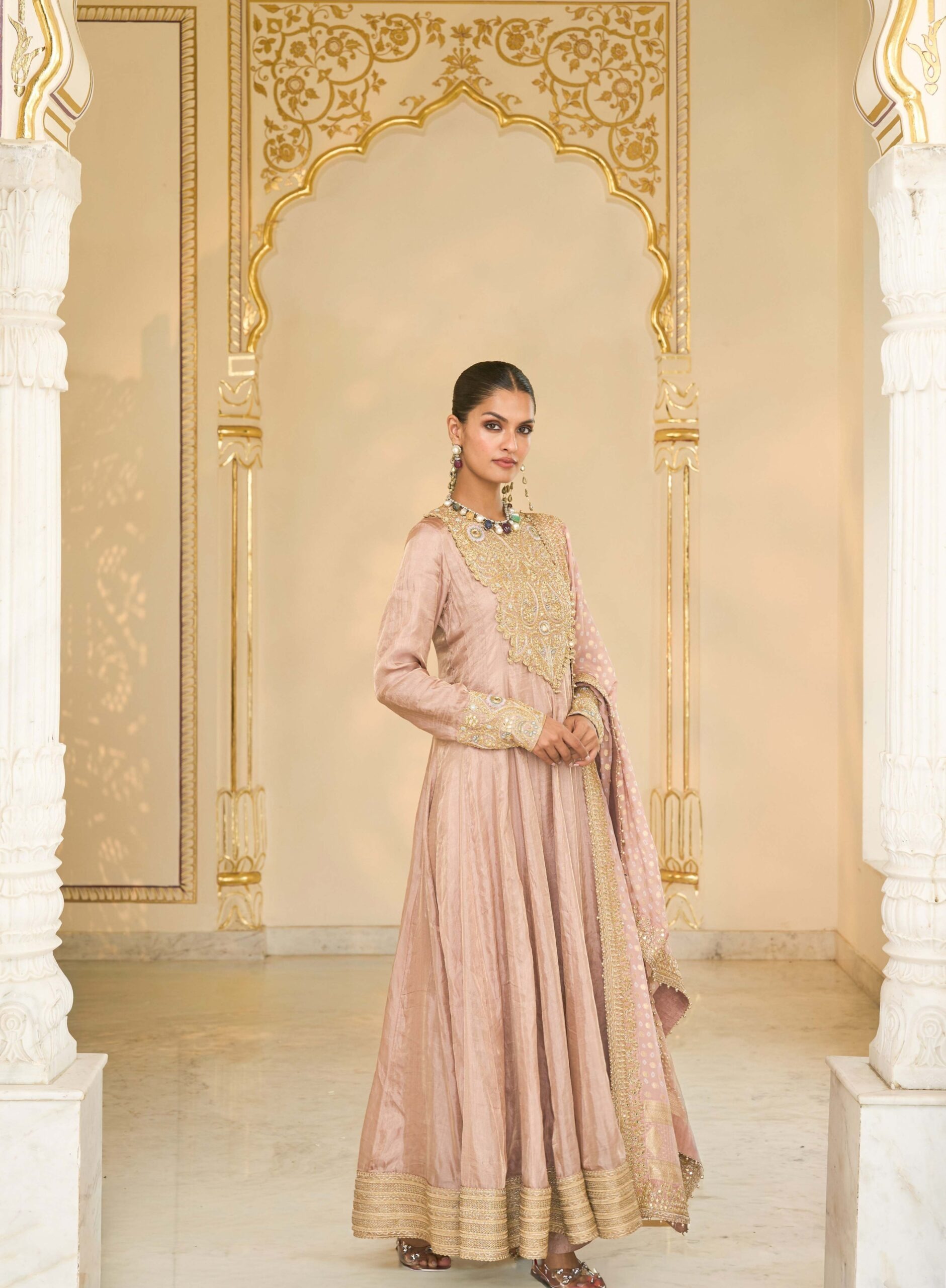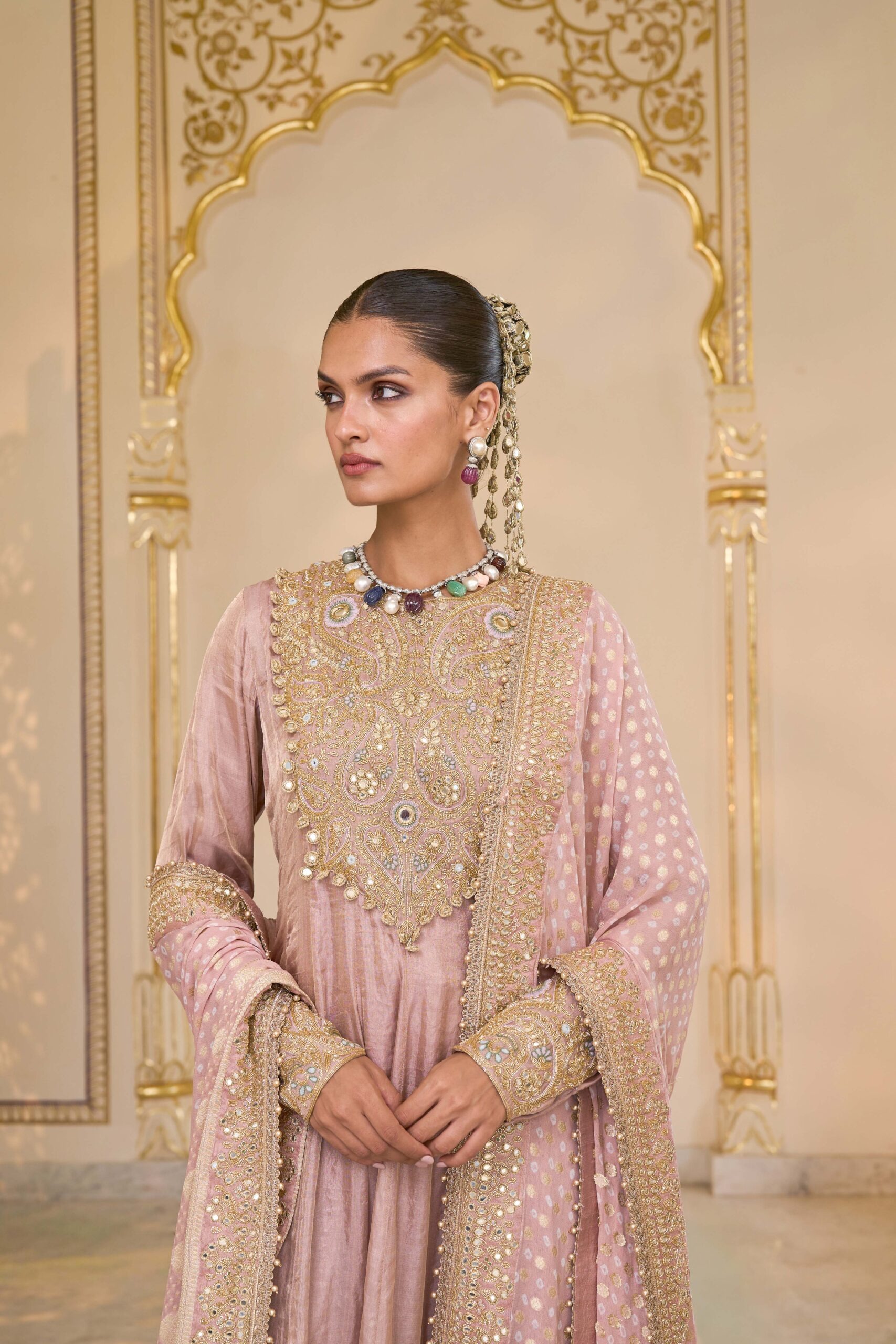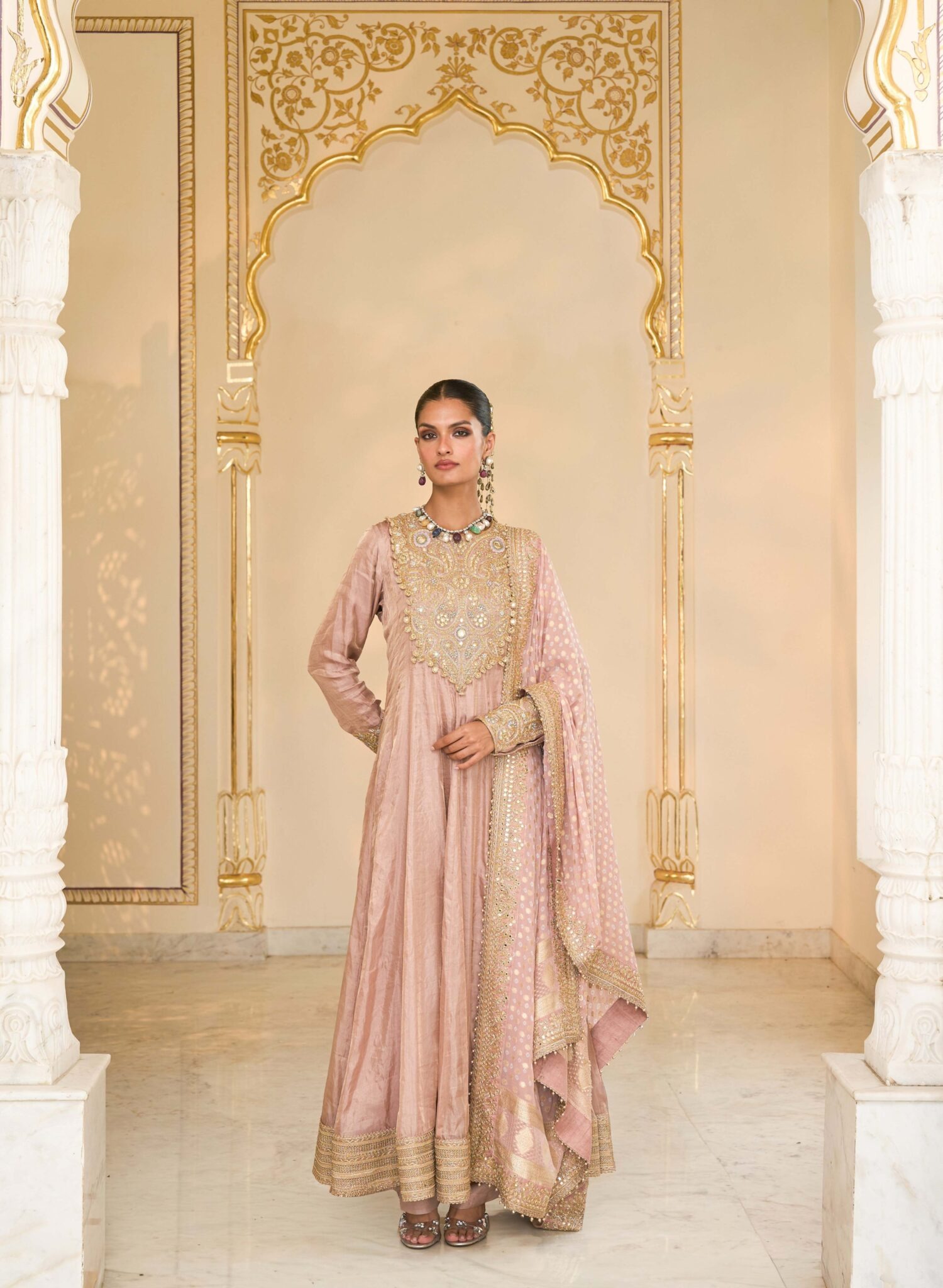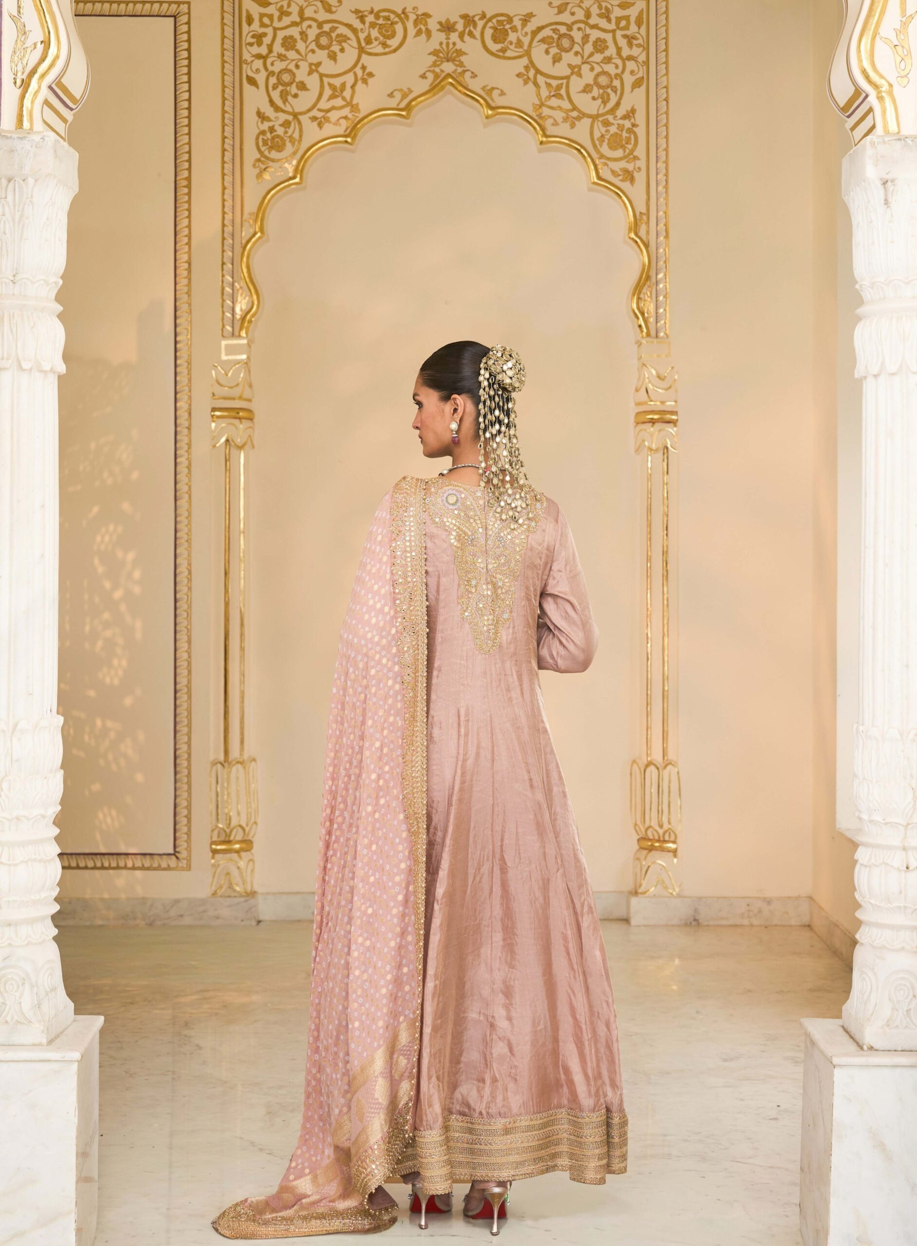 A delicately crafted anarkali set in soft rose tones, featuring refined handwork, a sleek churidar, and a beautifully detailed bandhani dupatta for an elegant festive or wedding look.