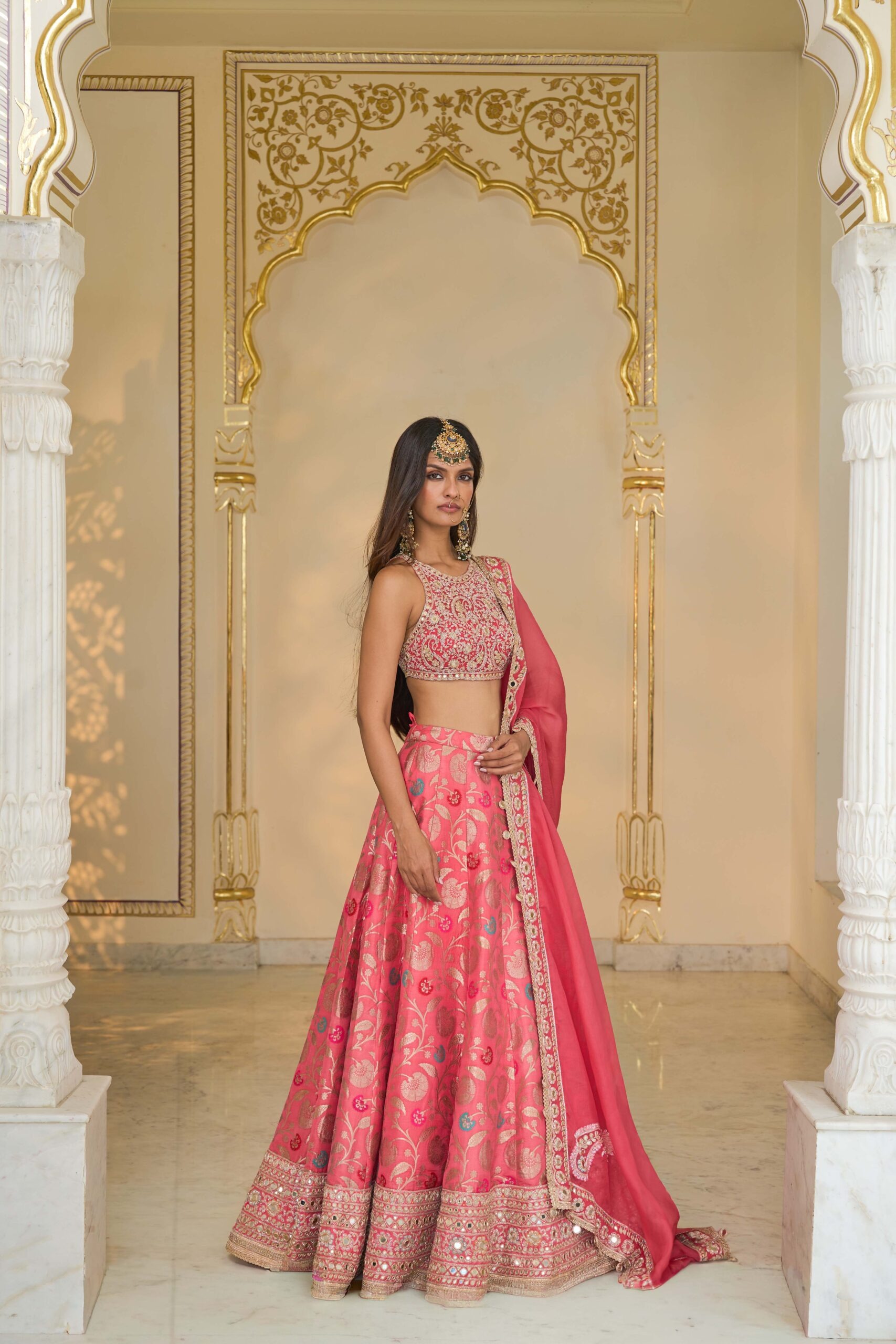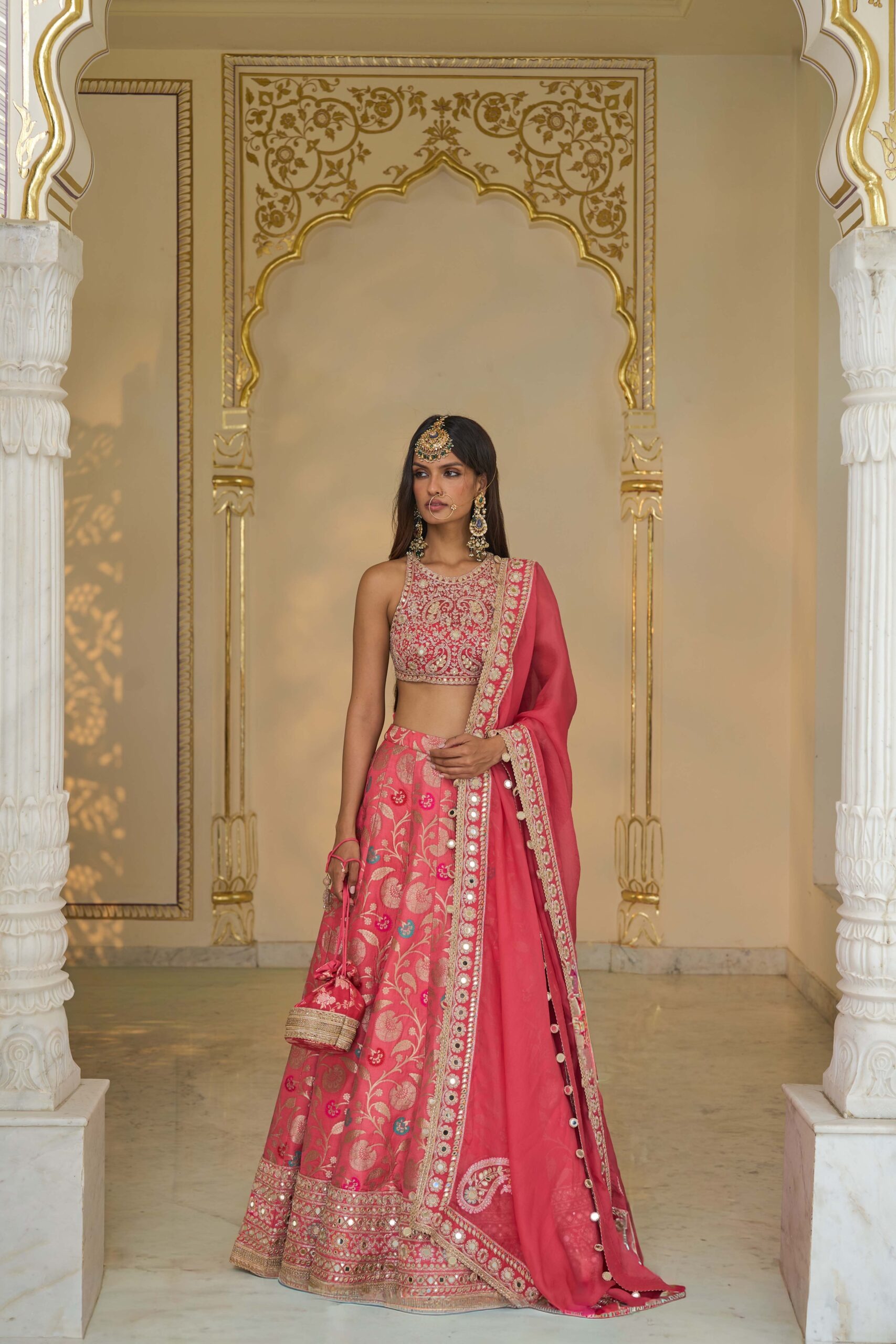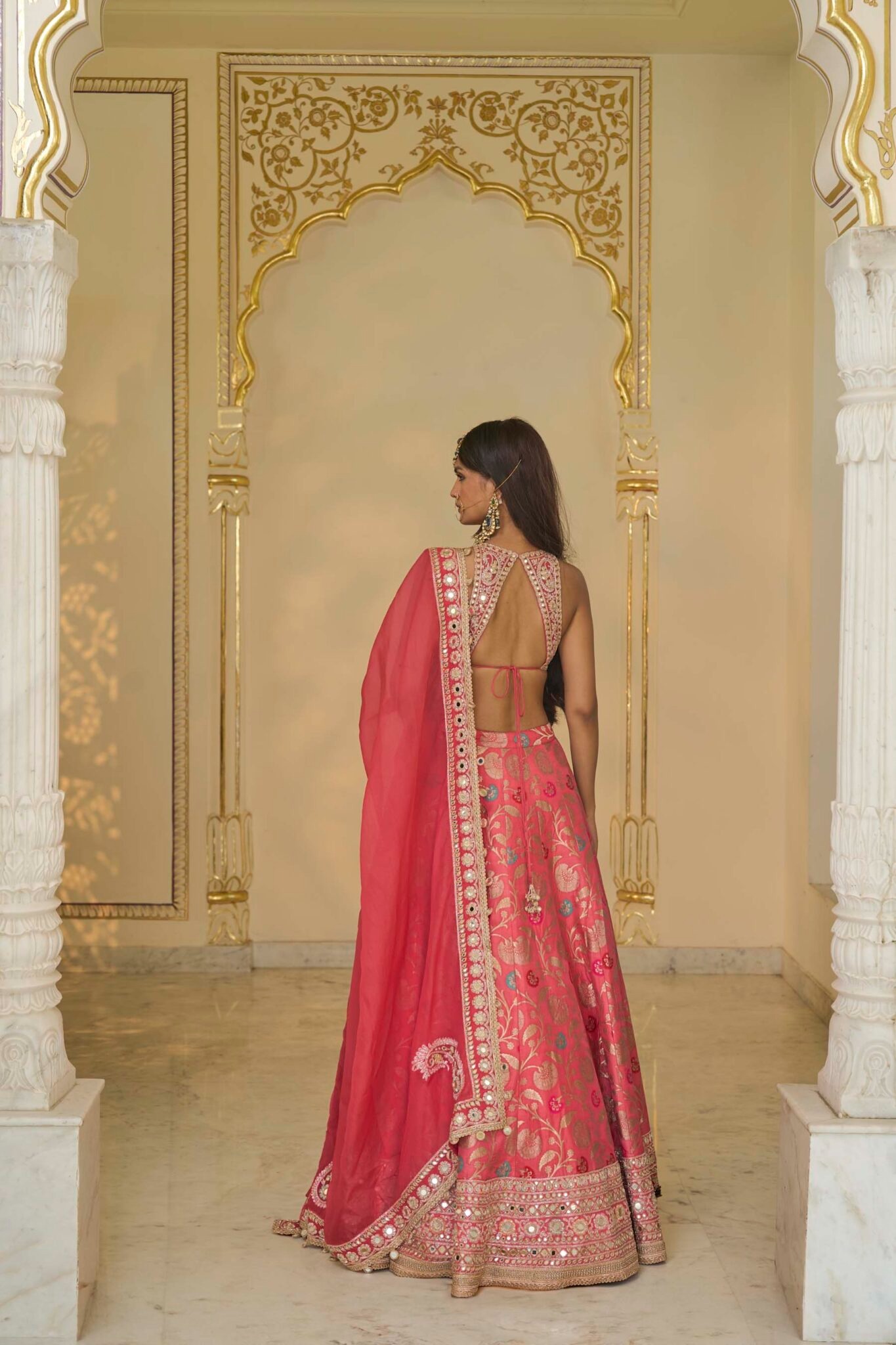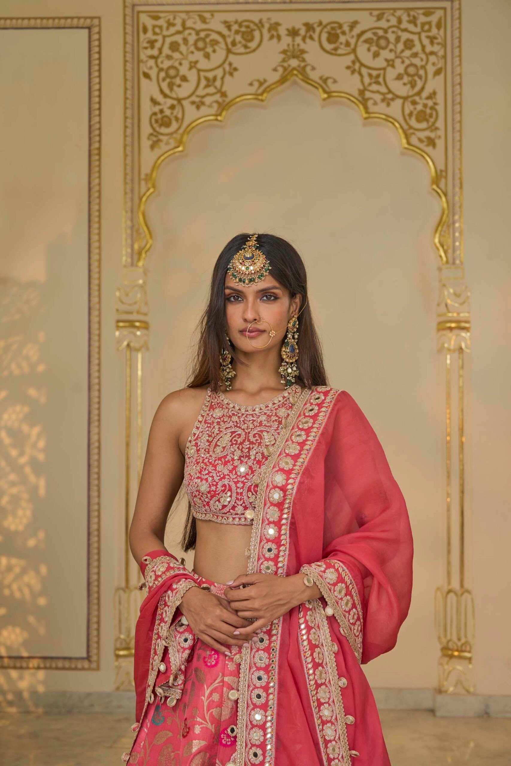 A raspberry-toned handcrafted banarasi lehenga set paired with an intricately finished organza dupatta, designed to bring refined elegance and contemporary artistry together.