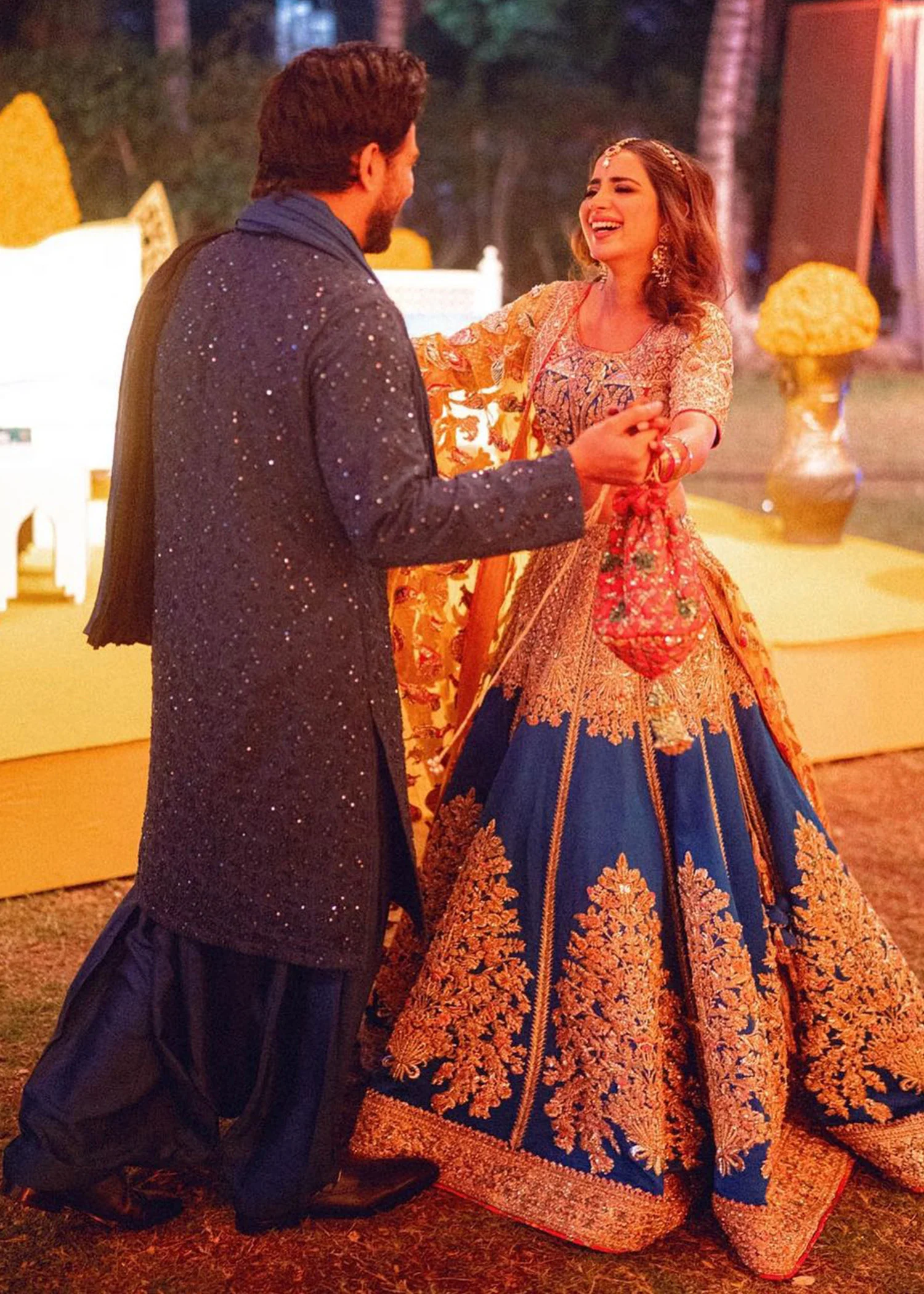 A stunning royal blue and gold bridal lehenga crafted from luxurious katan silk and adorned with exquisite handcrafted embellishment. Featuring a richly embroidered blouse, a voluminous flared lehenga detailed with golden appliqué, Swarovski crystals, and sequins, and a delicate gold chiffon dupatta with matching embellishment, this ensemble offers a perfect blend of regal sophistication and timeless elegance for the modern bride.
