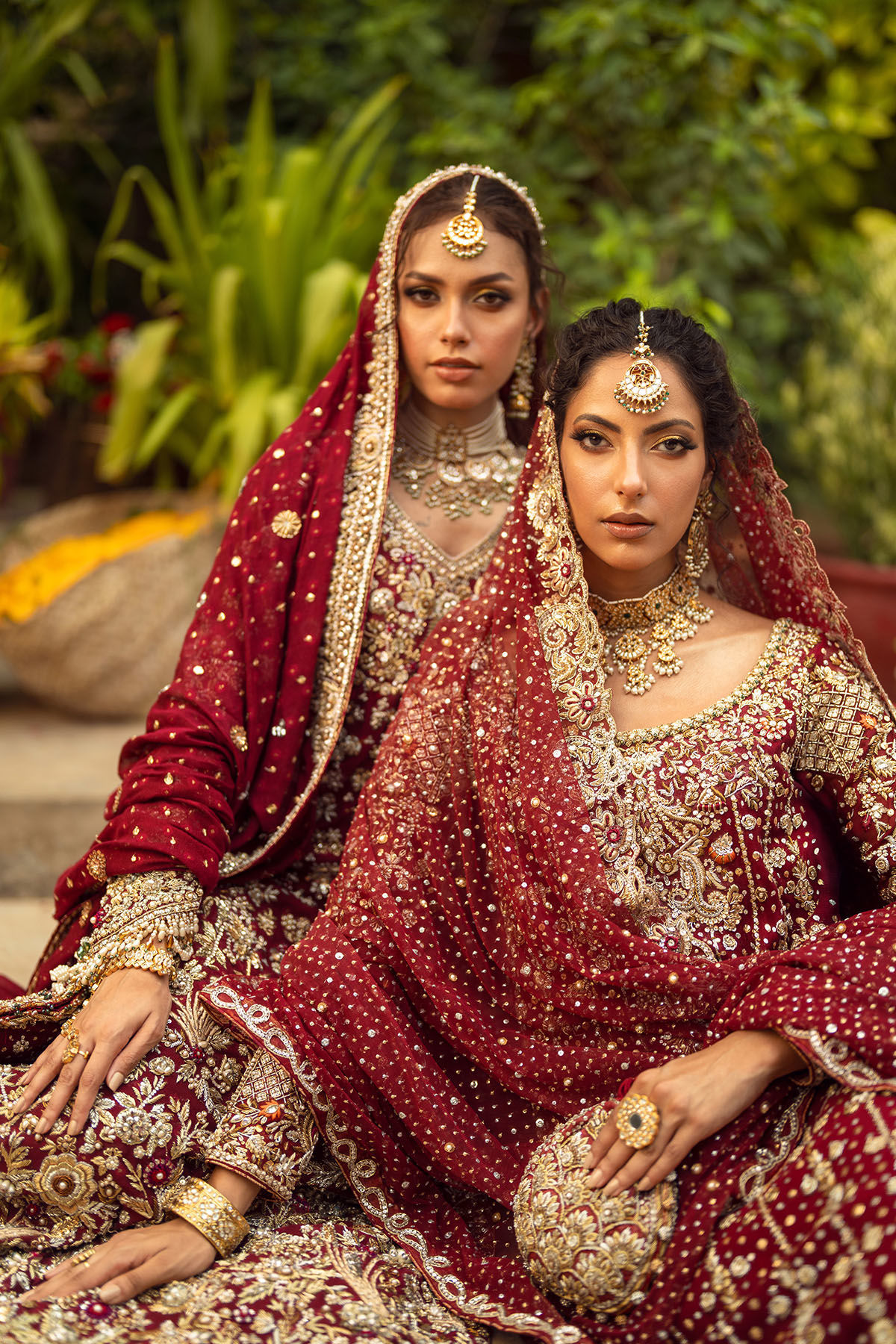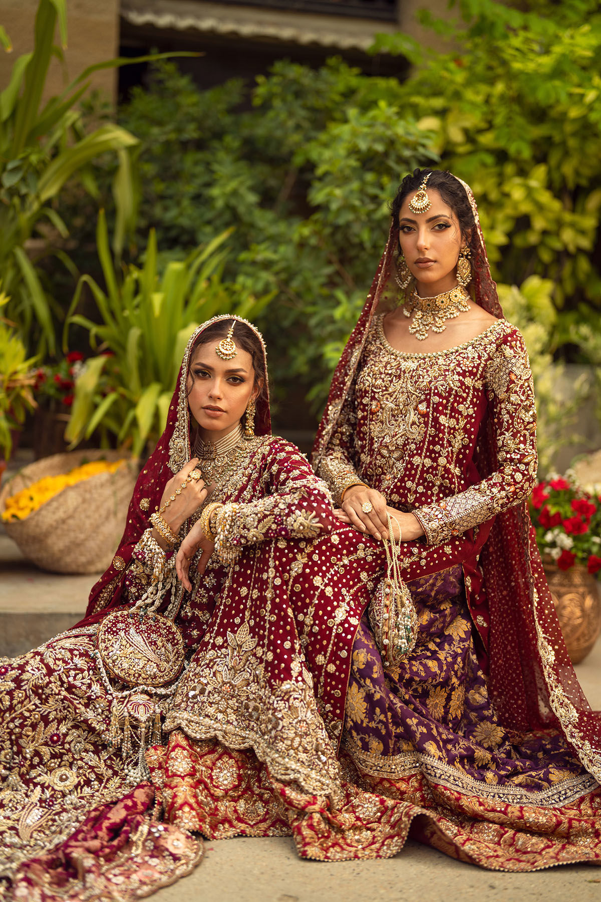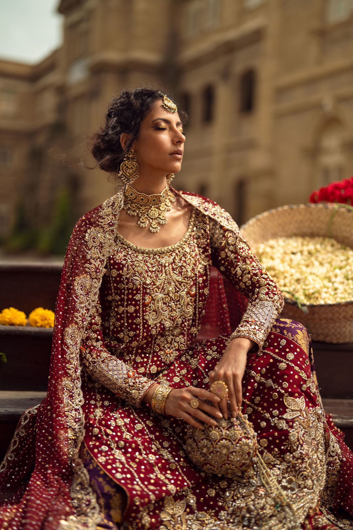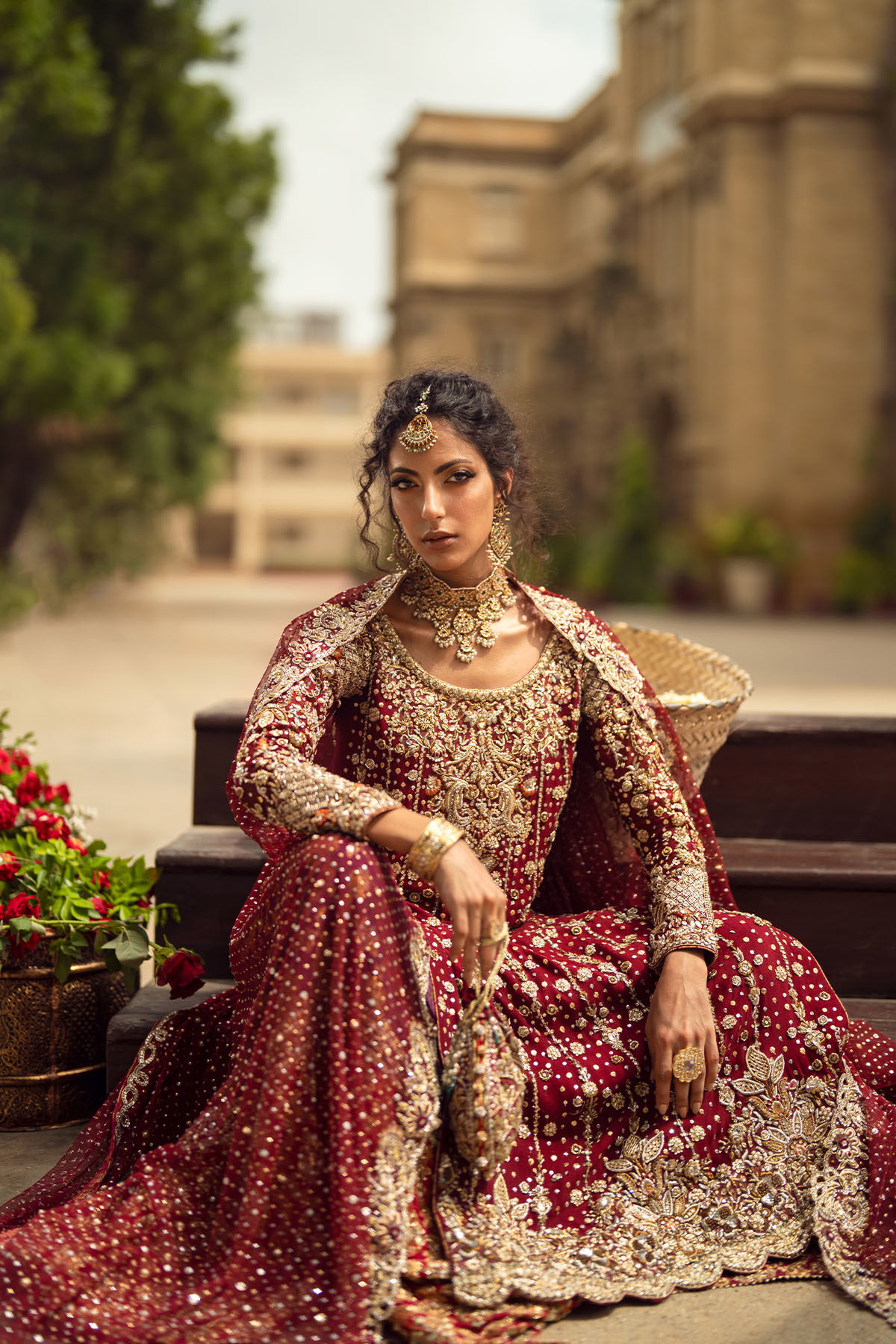 A luxurious maroon bridal outfit featuring a heavily embellished long coat, intricately designed gharara, and a graceful chiffon dupatta, finished with rich gold handcrafted detailing.