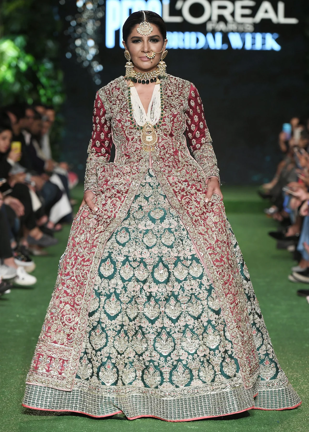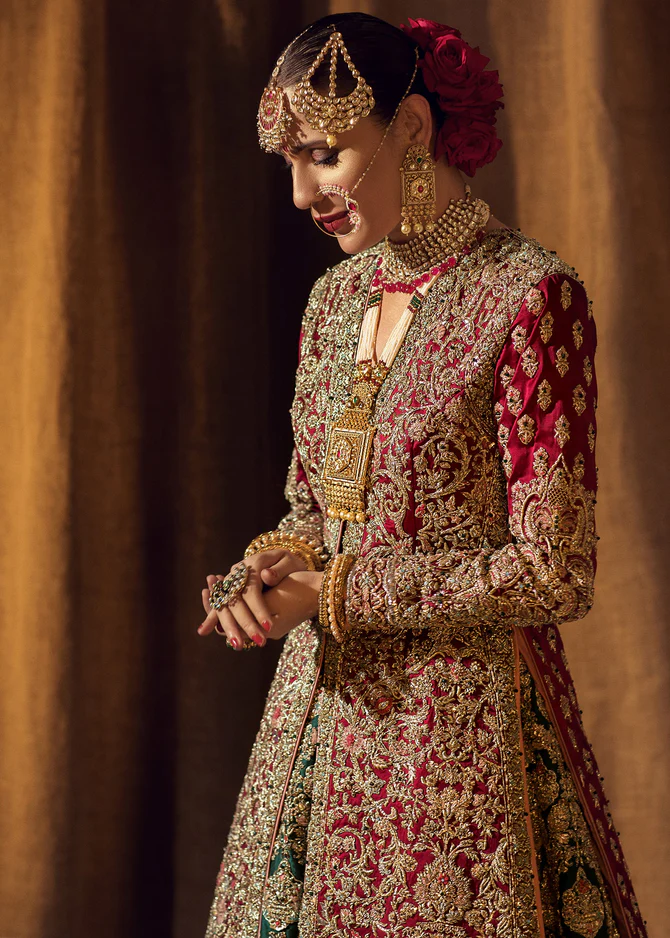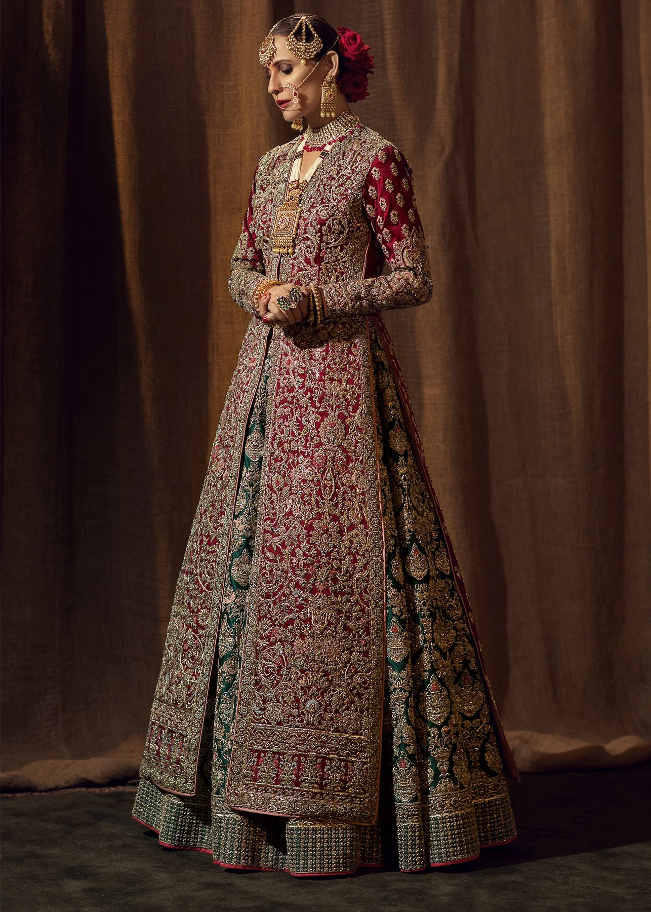 An opulent bridal ensemble featuring a maroon open-jacket silhouette over a majestic emerald green lehenga, fully encrusted with traditional gold handwork.
