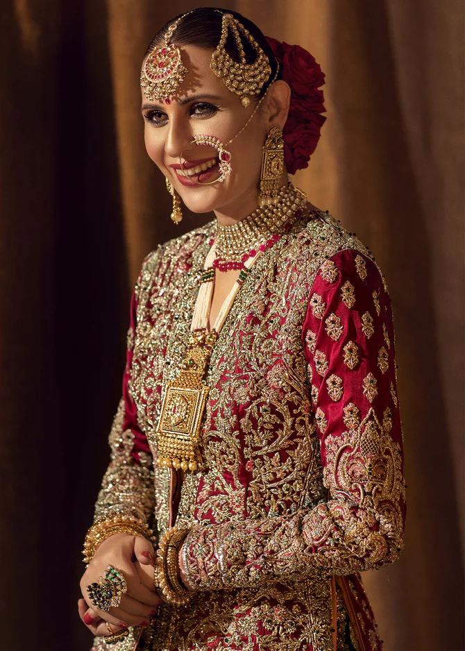Masterfully handcrafted using a blend of gold tilla, sequins, beads, kora, naqshi, and Swarovski crystal accents. The intricate needlework showcases traditional artisanal techniques designed for a luxurious bridal aesthetic.