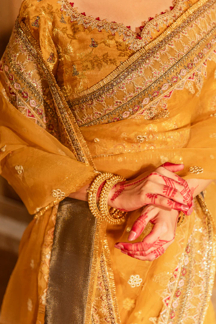 The mustard yellow saree is fashioned from premium organza, offering a fluid drape and luminous finish. Adorned with exquisite embroidery and sparkling embellishments, it delivers a breathtaking bridal presence. The borders and pallu are extensively decorated with gota, goldwork, and tilla artistry, creating a luxurious visual impact. The handcrafted detailing throughout the saree celebrates timeless Pakistani bridal aesthetics, making it a standout choice for weddings and traditional ceremonies.