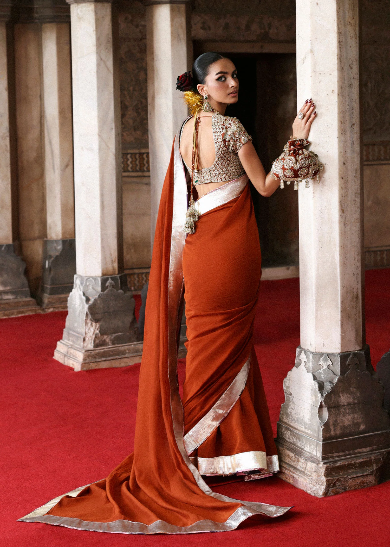 An elegant rust-toned Banarasi saree paired with a richly embellished blouse, featuring structured pleats and refined detailing for a graceful look suited to both day and evening occasions.