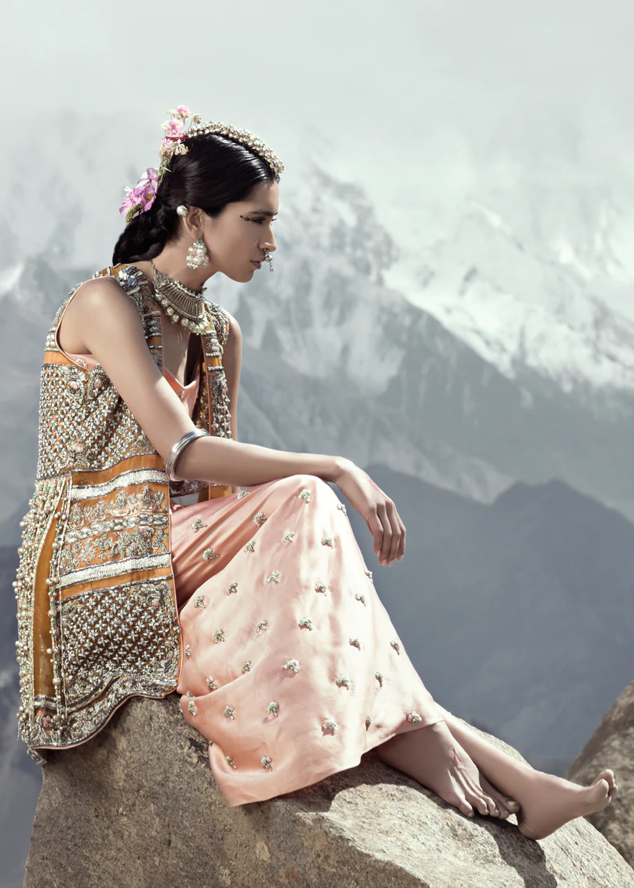 The underdress is made from smooth satin silk and styled with a modest flare. A dense arrangement of small handcrafted motifs covers the front, adding texture and visual interest while maintaining elegance. The lining ensures comfort and a smooth fit.