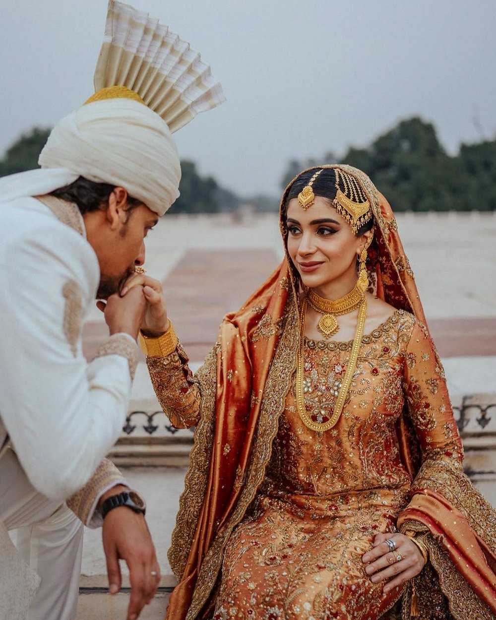The bottom wear is a voluminous, traditional Gharara in the same saffron/rust fabric. It is designed with significant volume and features heavy embellishment, continuing the same antique gold and sequin work from the shirt. The distinct ‘gote’ (knee seam) and the wide borders along the hem of the Gharara are densely packed with gold embroidery, creating a dramatic, heavy fall and traditional silhouette.
