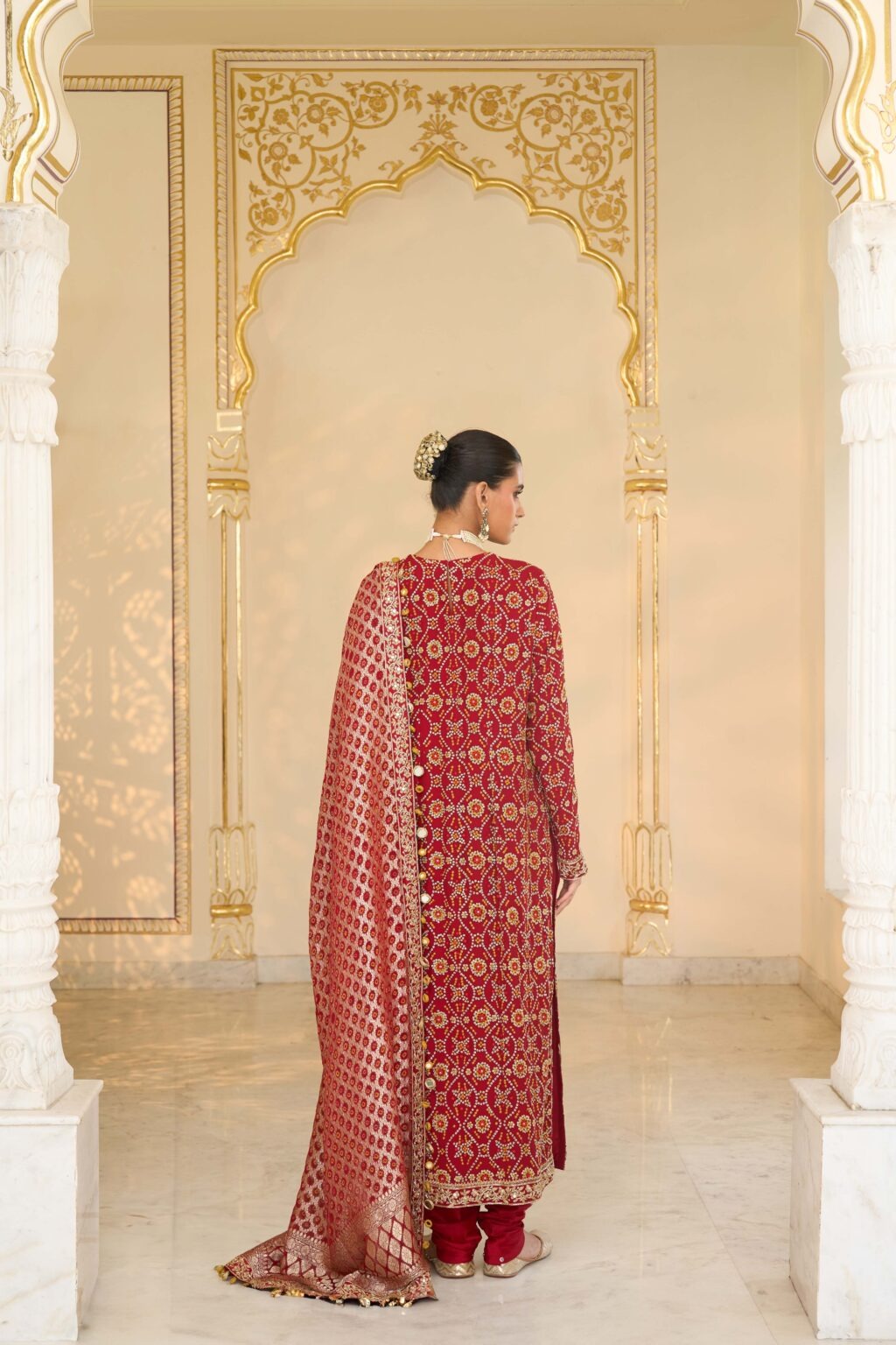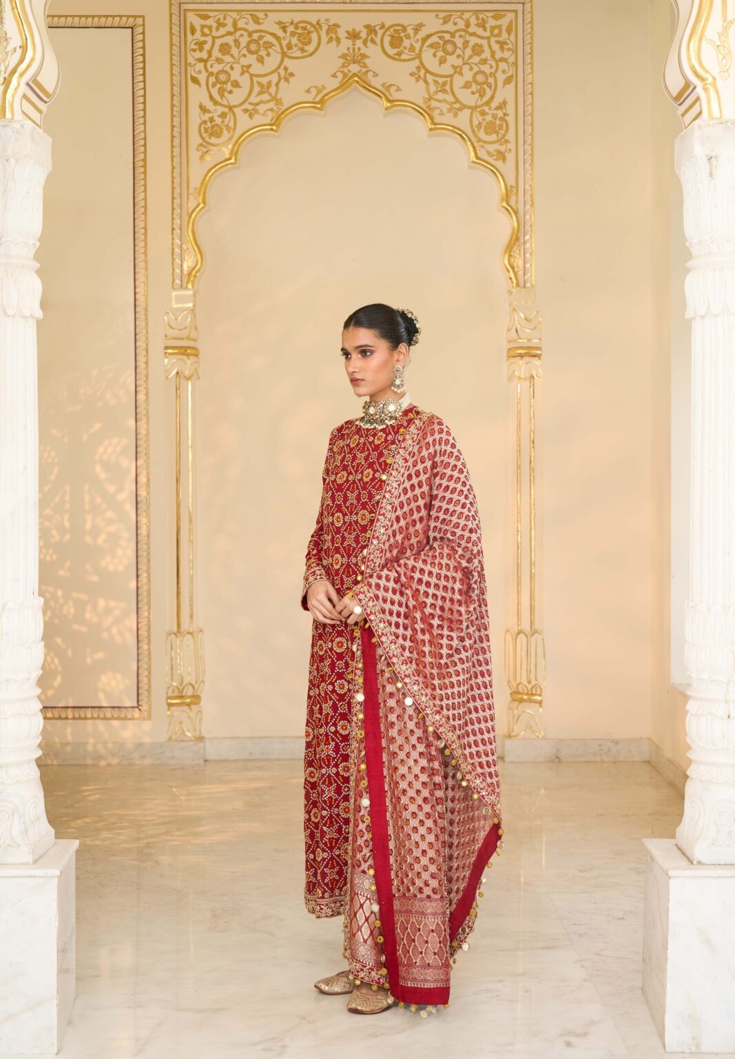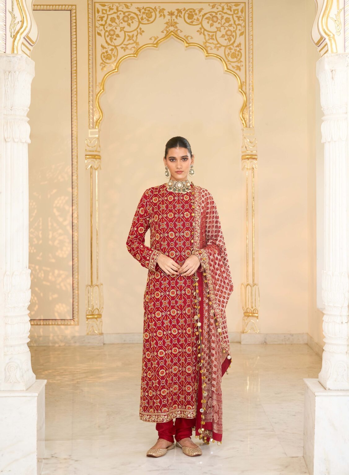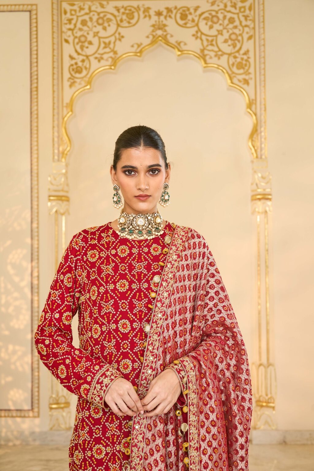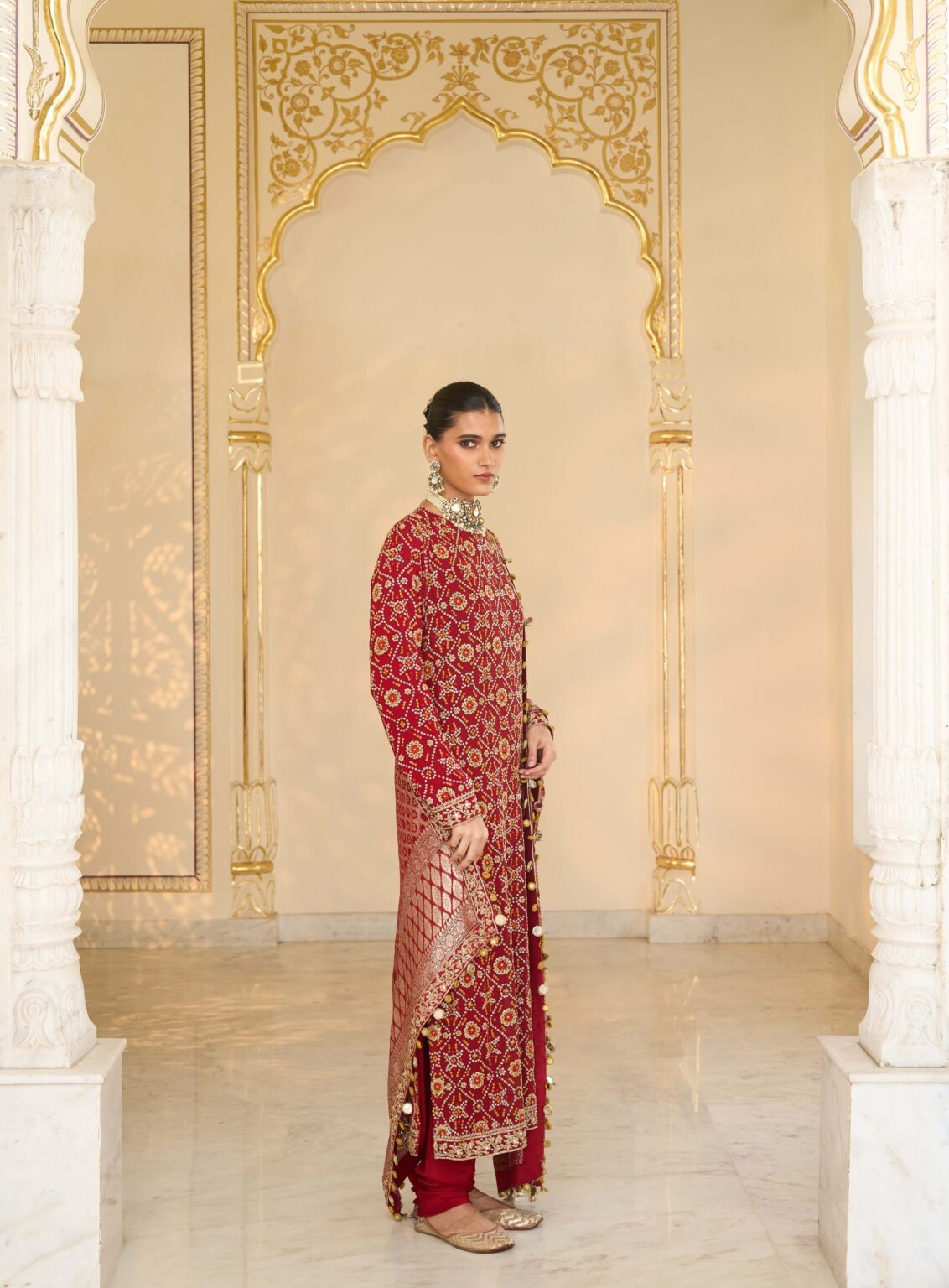 The long kurta is crafted in a rich red tone with bandhani artistry forming the base of its design. The surface is enhanced with detailed hand embroidery incorporating mirror accents, multi-thread work, and fine cutdana placement. The embellishment elevates the traditional bandhani pattern, creating a refined balance of color, texture, and craftsmanship suited for wedding festivities.
