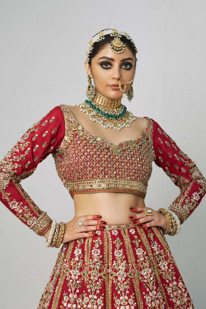 The choli is crafted from luxurious silk, designed to offer a structured yet elegant bridal silhouette. It is adorned with intricate handcrafted embellishments featuring gotta, dabqa kora, sitara, and marori tilla work, creating a rich, textured surface with refined metallic brilliance. The detailed embroidery highlights the artisanal finesse of the piece, while a soft inner lining ensures comfort and a flawless fit throughout wear.