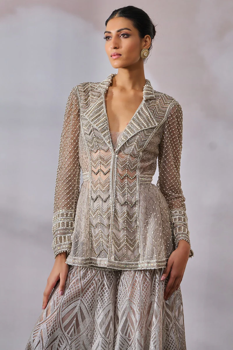 A contemporary masterpiece of bridal couture, this metallic silver ensemble features a structured, pearl-encrusted peplum jacket with architectural lapels, paired with matching geometrically embroidered sharara trousers for a high-fashion, luminous silhouette.