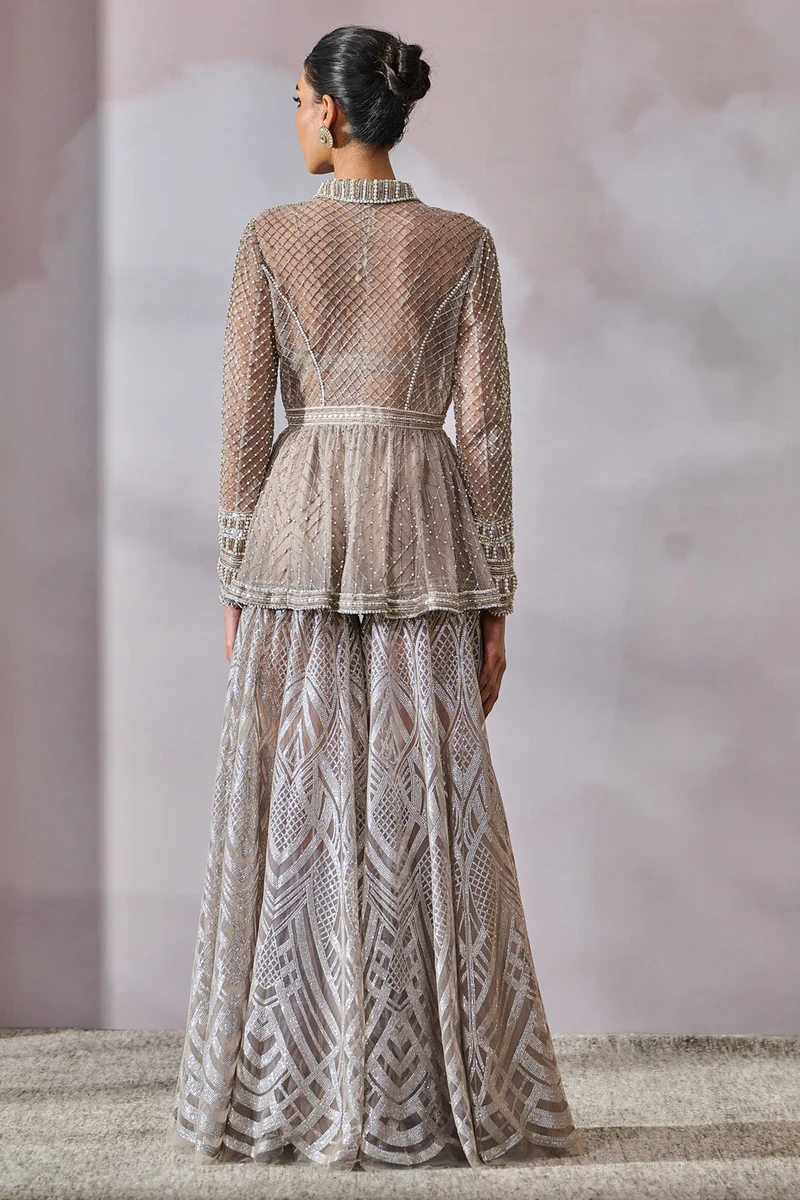 The ensemble is accompanied by a sheer, ethereal silver net dupatta that beautifully catches the light. It features a meticulously embroidered border that echoes the architectural pinstripes and geometric patterns found on the jacket and sharara.