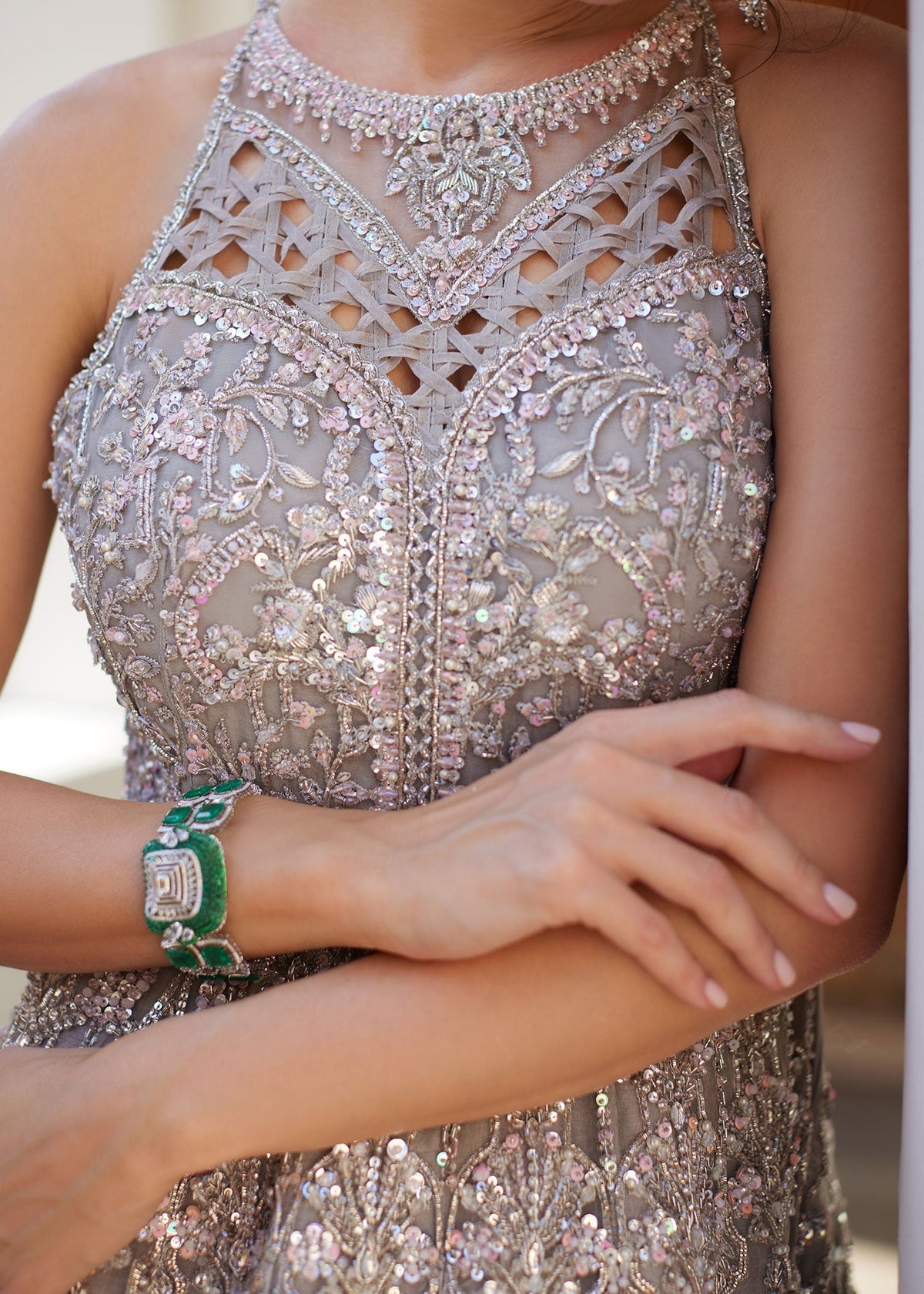 Refined silver embellishments combined with detailed stitching accents, thoughtfully arranged to enhance texture, luminosity, and modern bridal elegance.