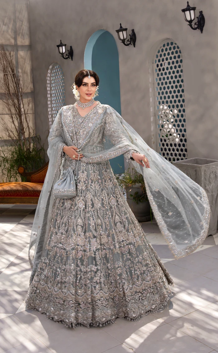 Soft, dreamy blue enhanced with contrasting pink embroidery and golden-silver zardozi detailing.