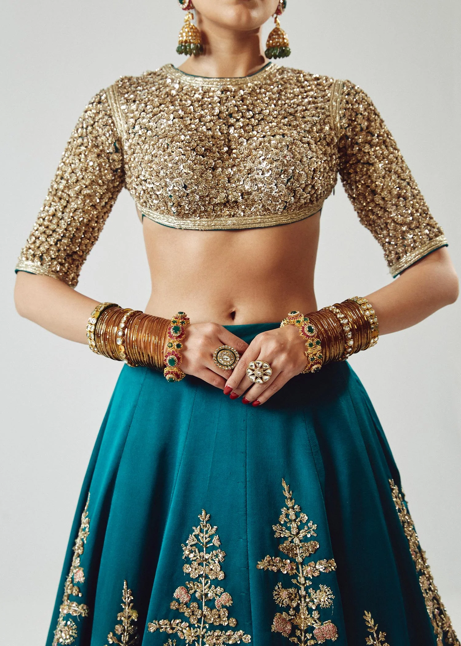 The lehenga is tailored from luxurious pure satin silk in matching teal green and highlighted with scalp borders that complement the intricate detailing of the choli. Its flared structure provides a regal drape, perfect for bridal celebrations.