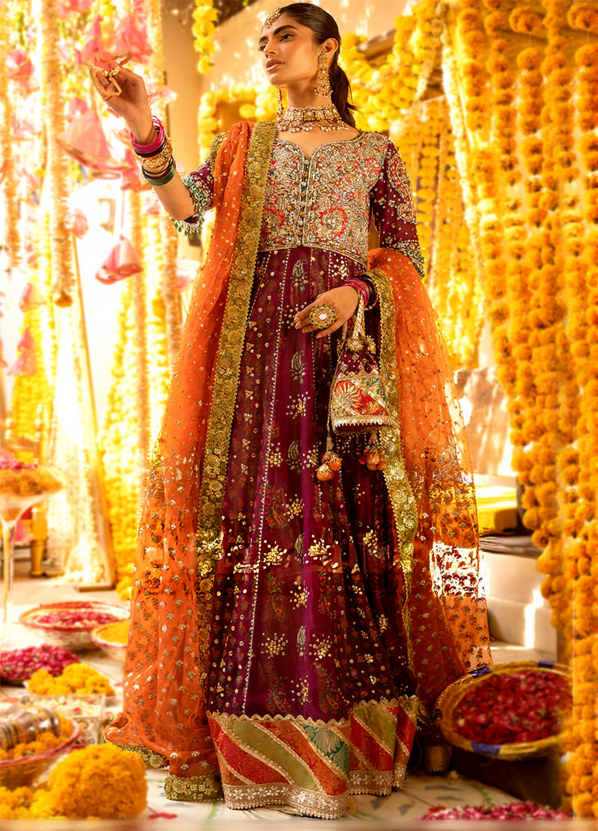 Intricate thread embroidery, sequins, and floral motifs applied carefully to enhance the richness and festive appeal of the ensemble.