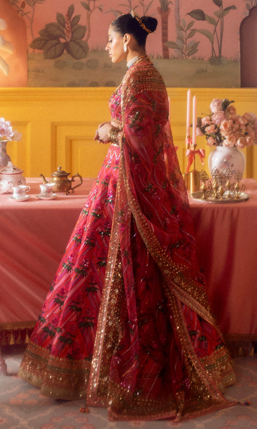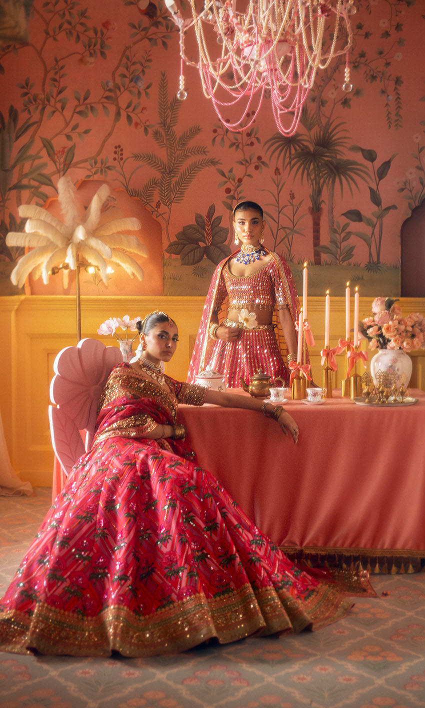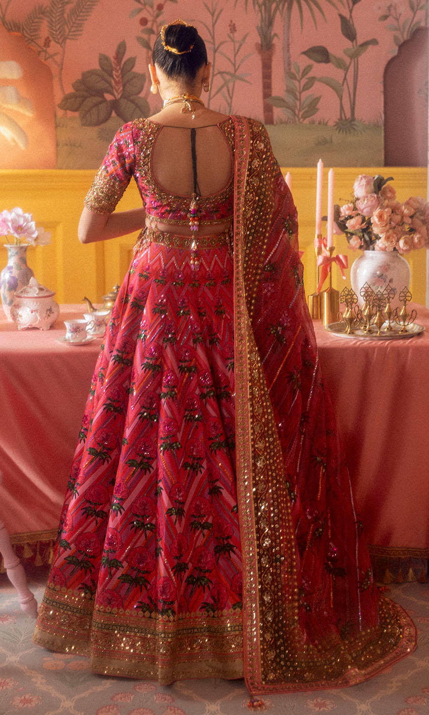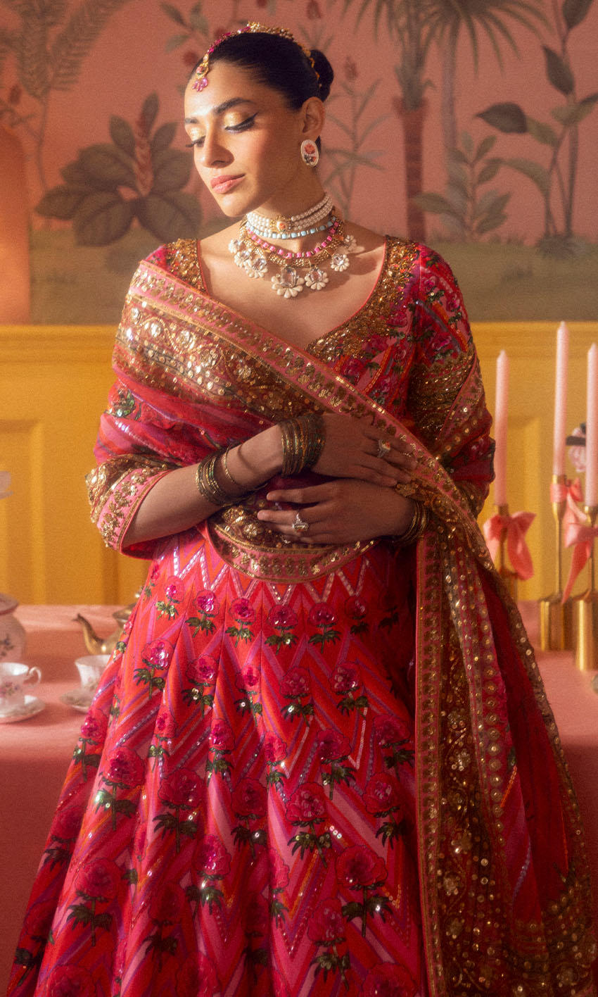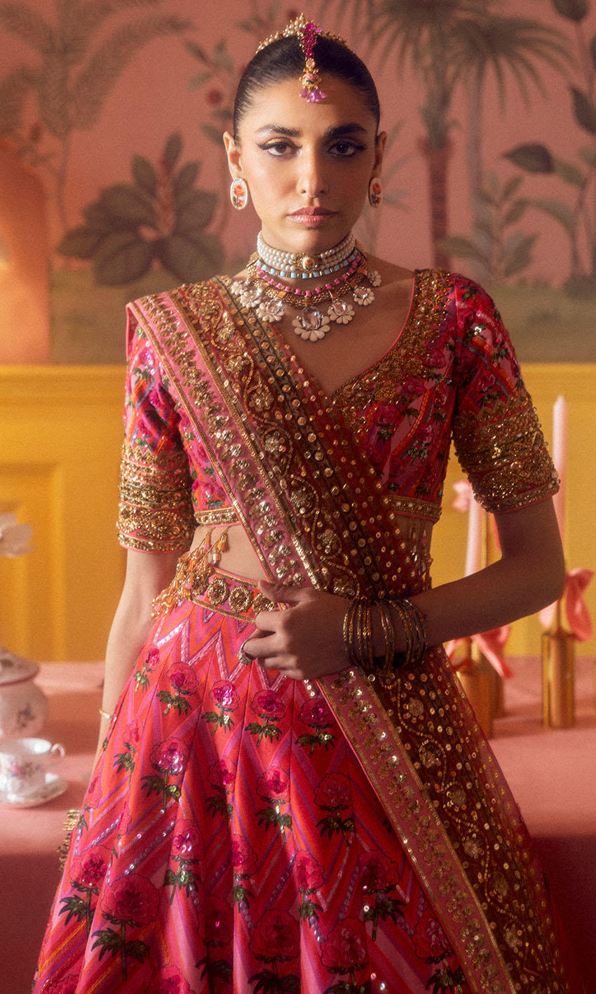 The choli is crafted from soft raw silk in a vibrant pink shade and adorned with intricate handwork, including chevron patterns and bright rose motifs. The embellishments are carefully applied to create a bold, contemporary look while maintaining a structured and comfortable fit.