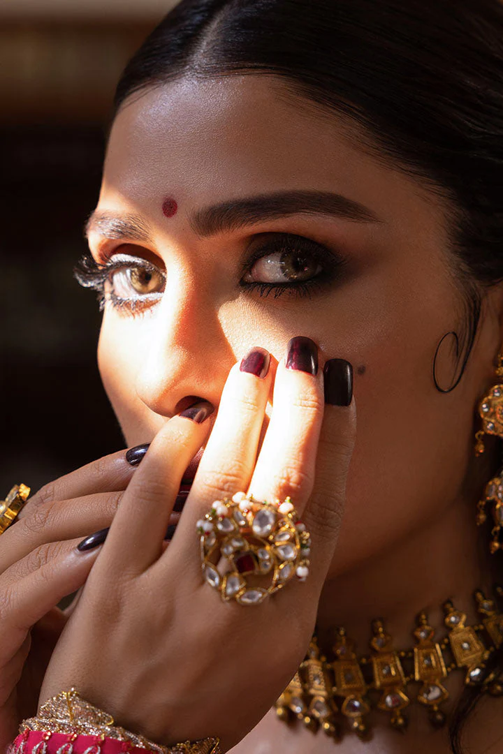 Intricate handcrafted work involving tilla embroidery, zari, sequins, and beadwork to create elaborate traditional designs.