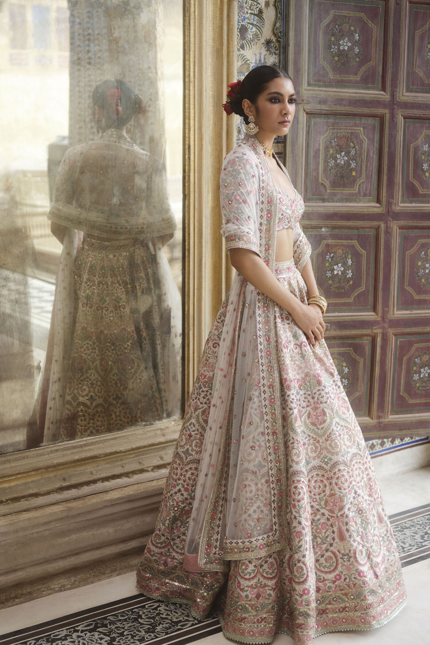 The dupatta is made from an ethereal, sheer white organza, bordered with detailed embellishment and rose-toned threadwork that complements the lehenga. It is scattered with delicate sequin “botis” and beads to add a soft radiance to the overall look. The edges are finished with a refined trim, preserving a lightweight drape that allows the intricate details of the choli and waist to remain visible.