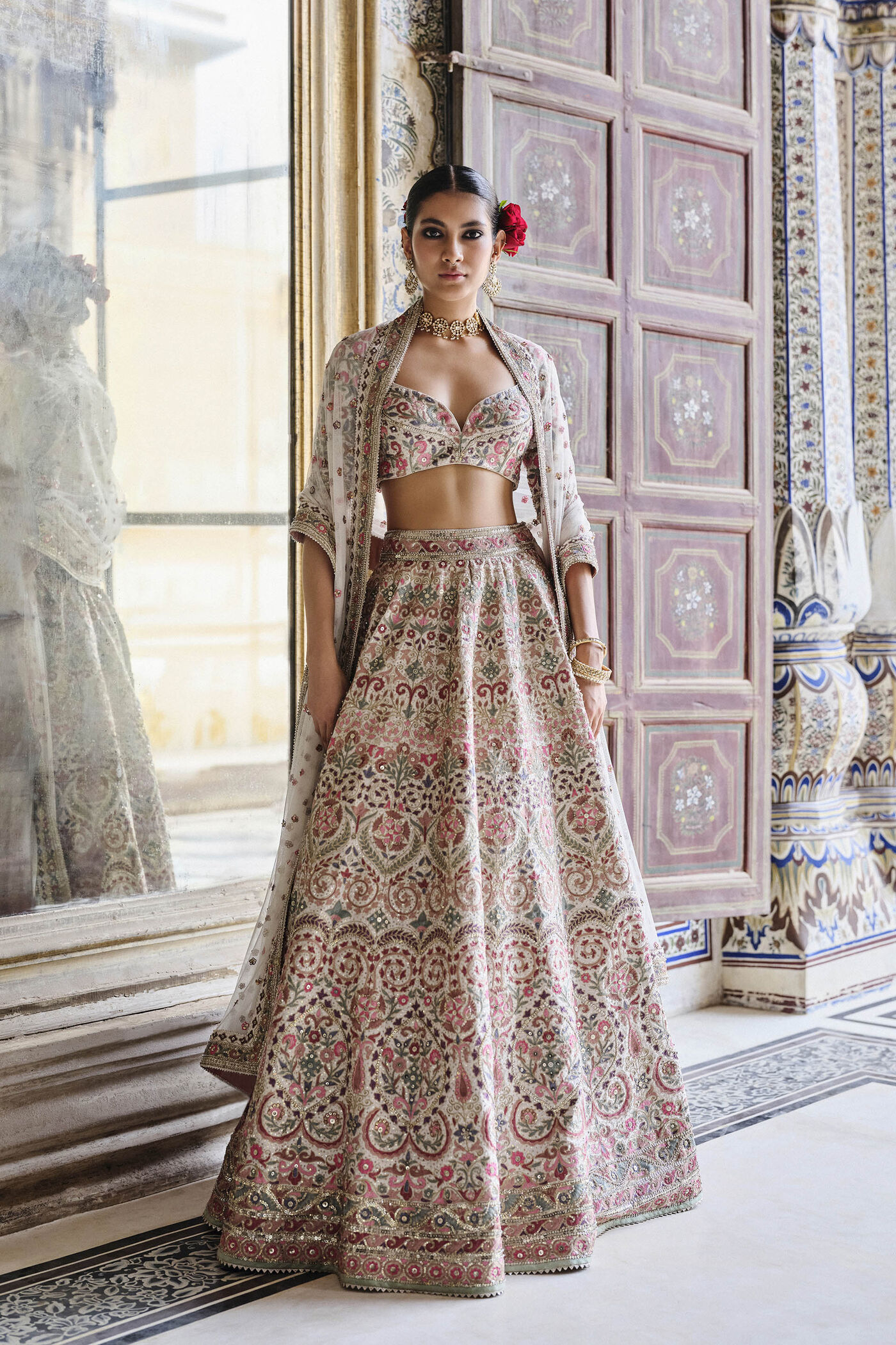 A majestic ivory and cream ensemble featuring a sweetheart choli and a grandly flared lehenga, intricately woven with traditional Persian-inspired floral scrolls and soft rose-toned embroidery.