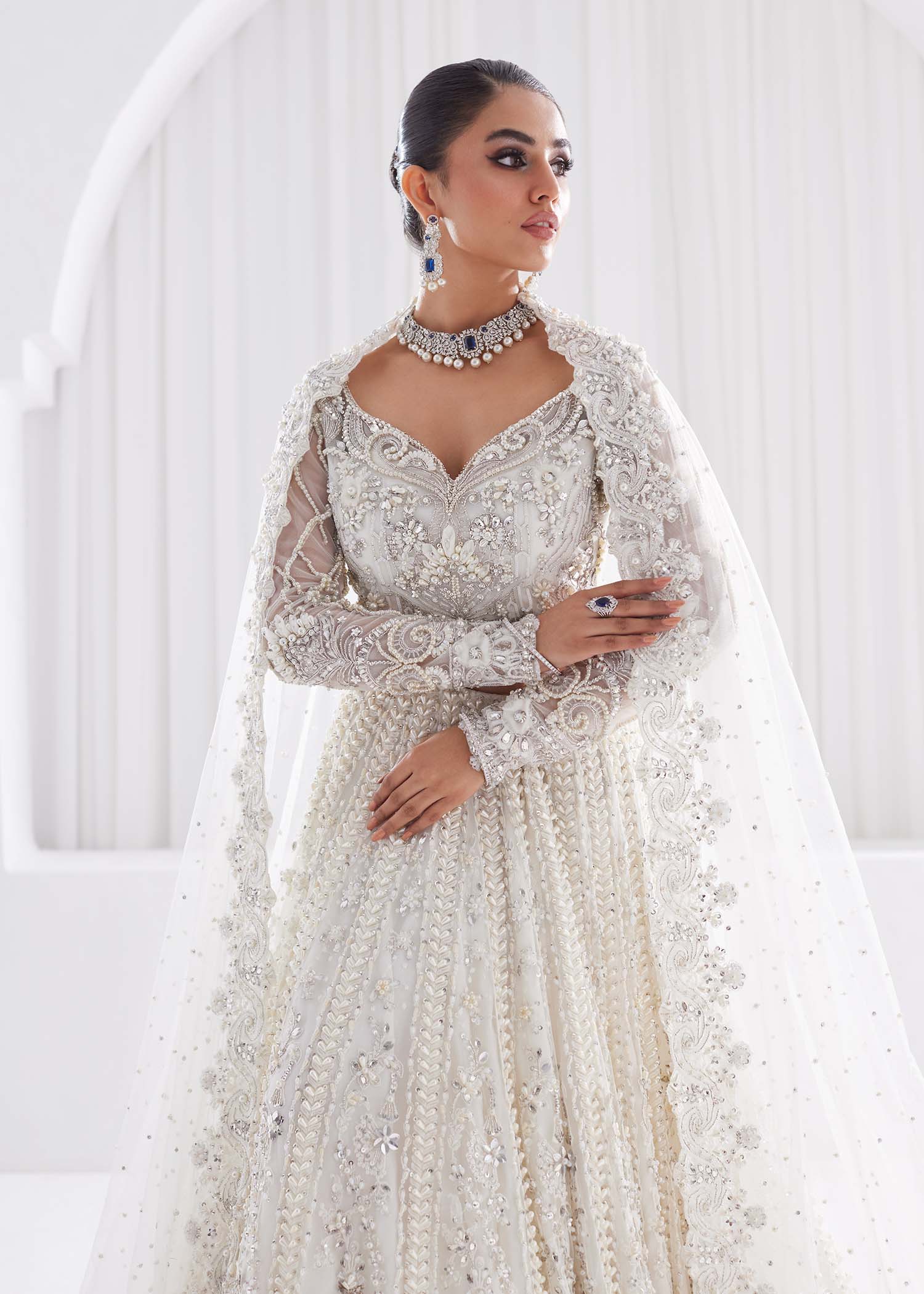 The matching veil is crafted in sheer white net and completed with gentle detailing along the borders. Depending on market availability, certain materials such as mukesh patterns may vary, but the closest matching alternative will always be provided. The veil drapes softly, adding an ethereal finishing touch to the ensemble.
