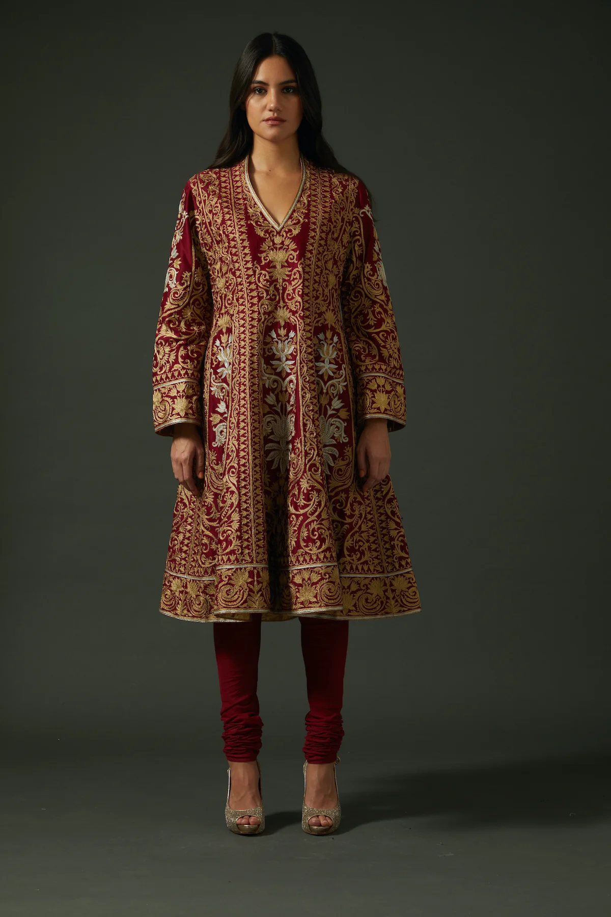 Refined embroidery featuring thread motifs and subtle detailing to enhance the ensemble’s understated elegance.