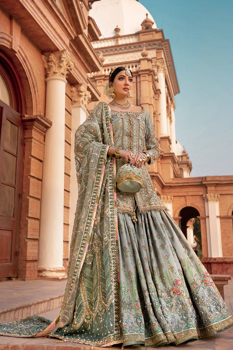 A serene jade green bridal ensemble featuring a shervani-style kameez, a digitally printed gharara, and dual dupattas enriched with traditional hand embroidery and refined detailing.