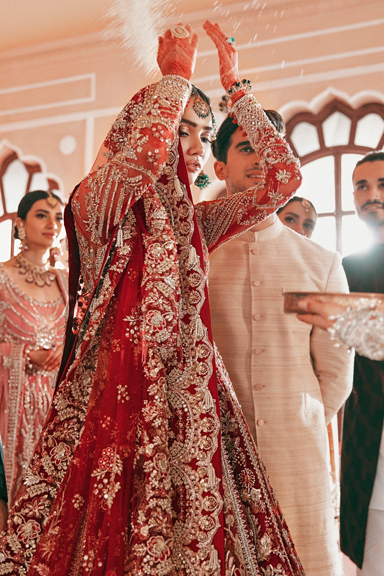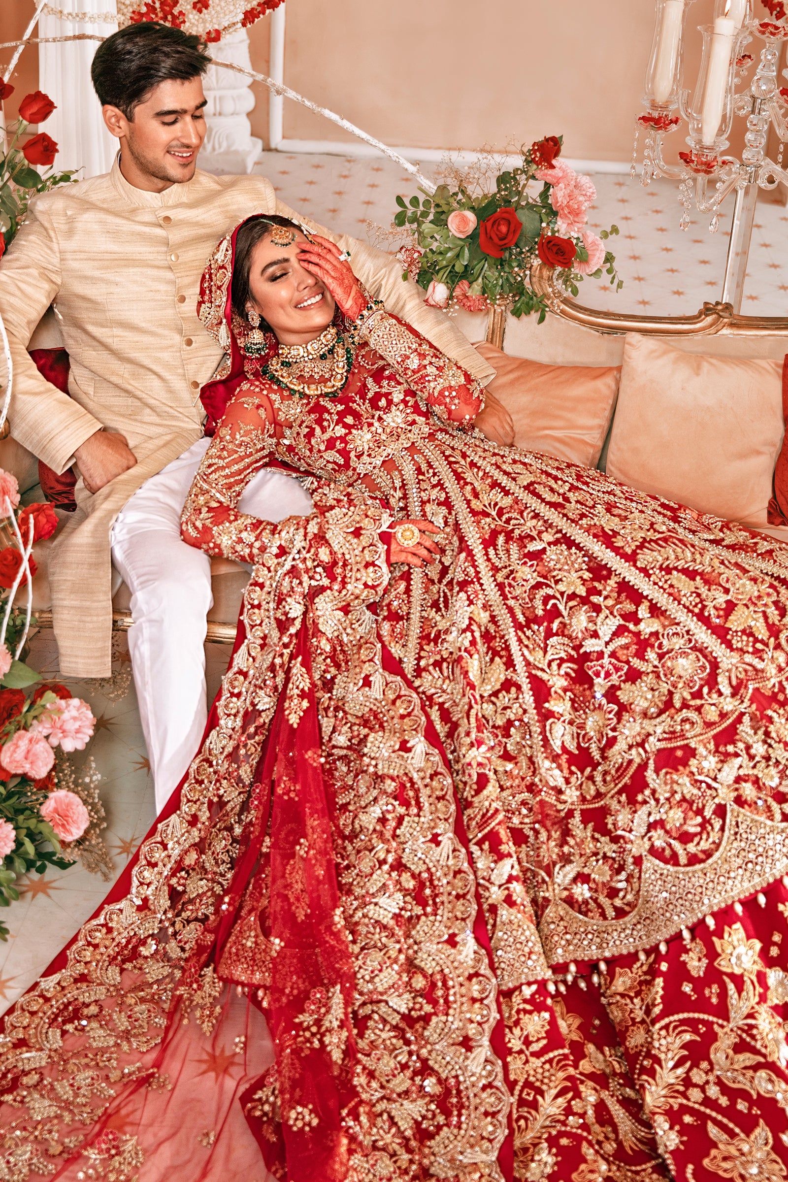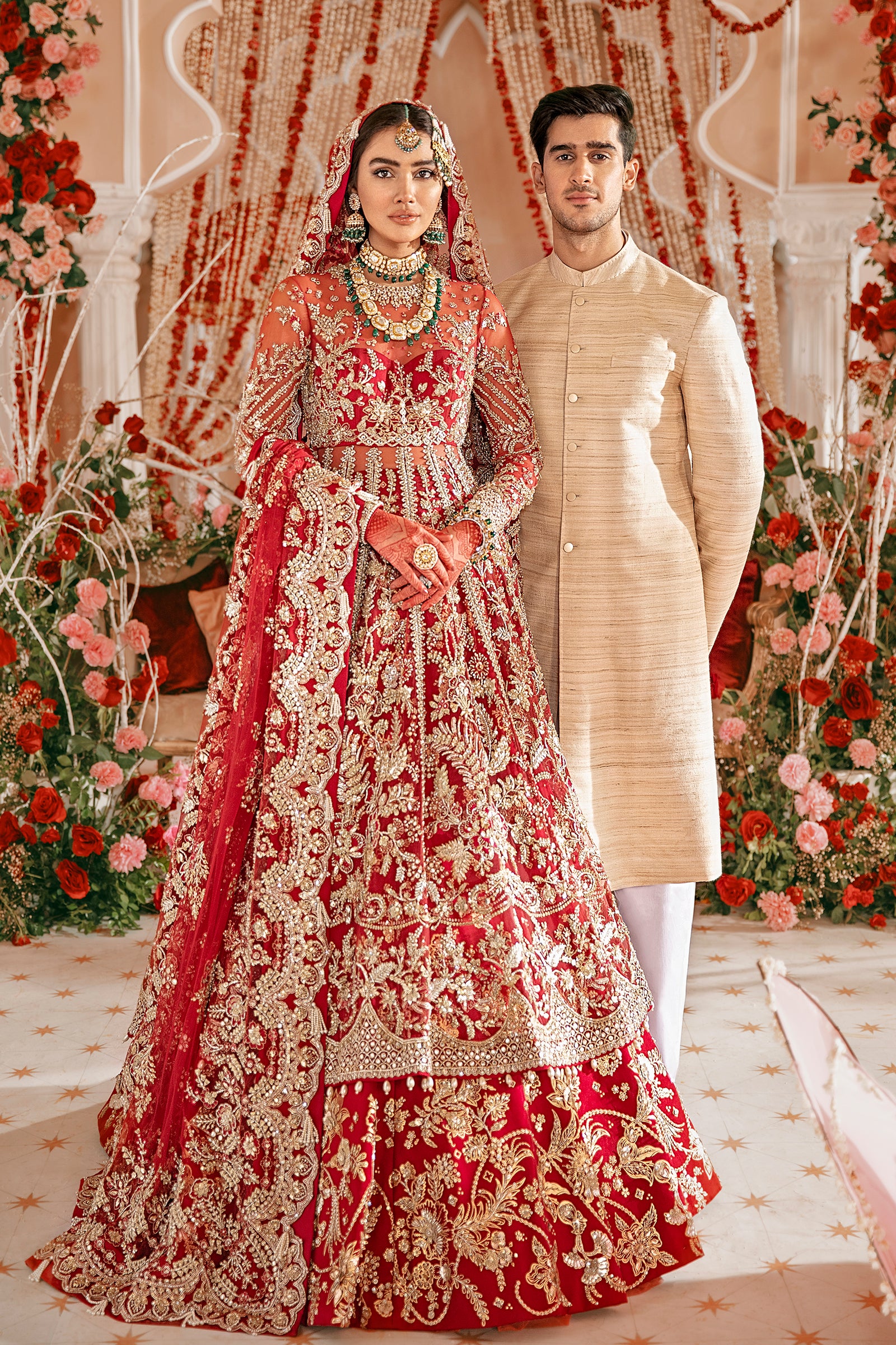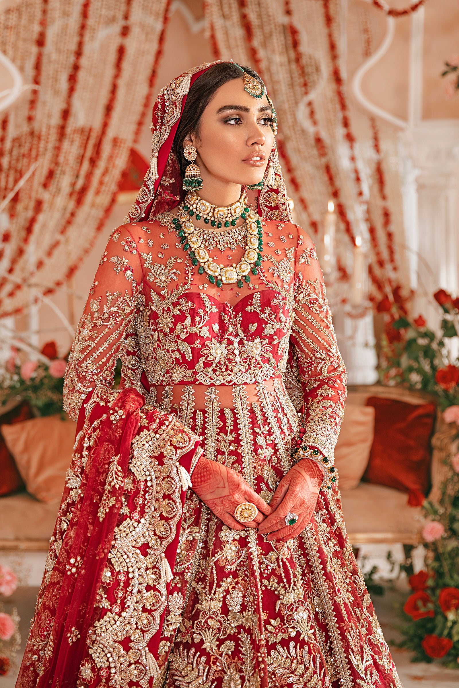 A timeless red bridal ensemble, Ruby Regal features a gold and silver zardozi anarkali, paired with an organza lehenga and a heavily embellished net dupatta for a resplendent couture finish.
