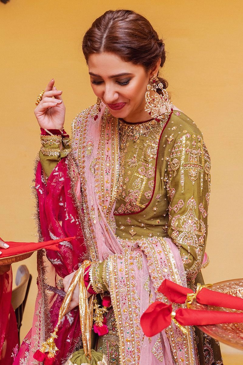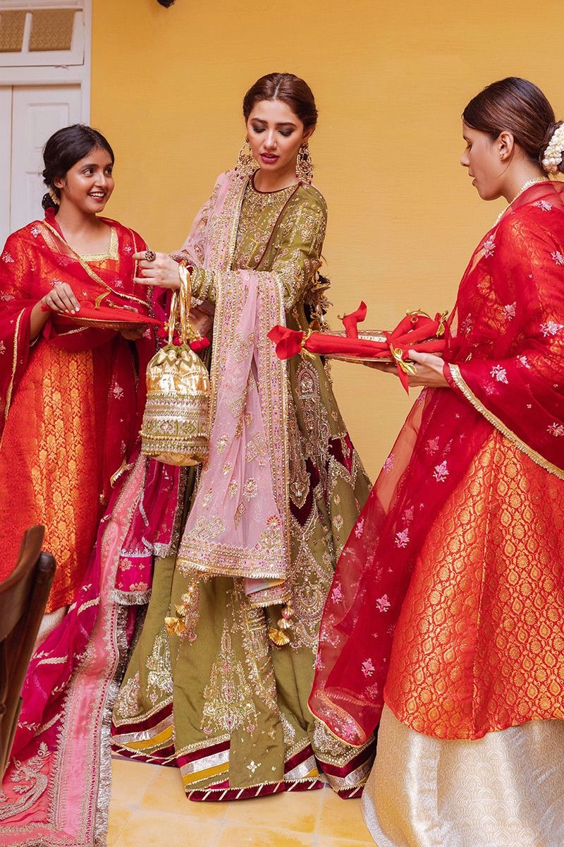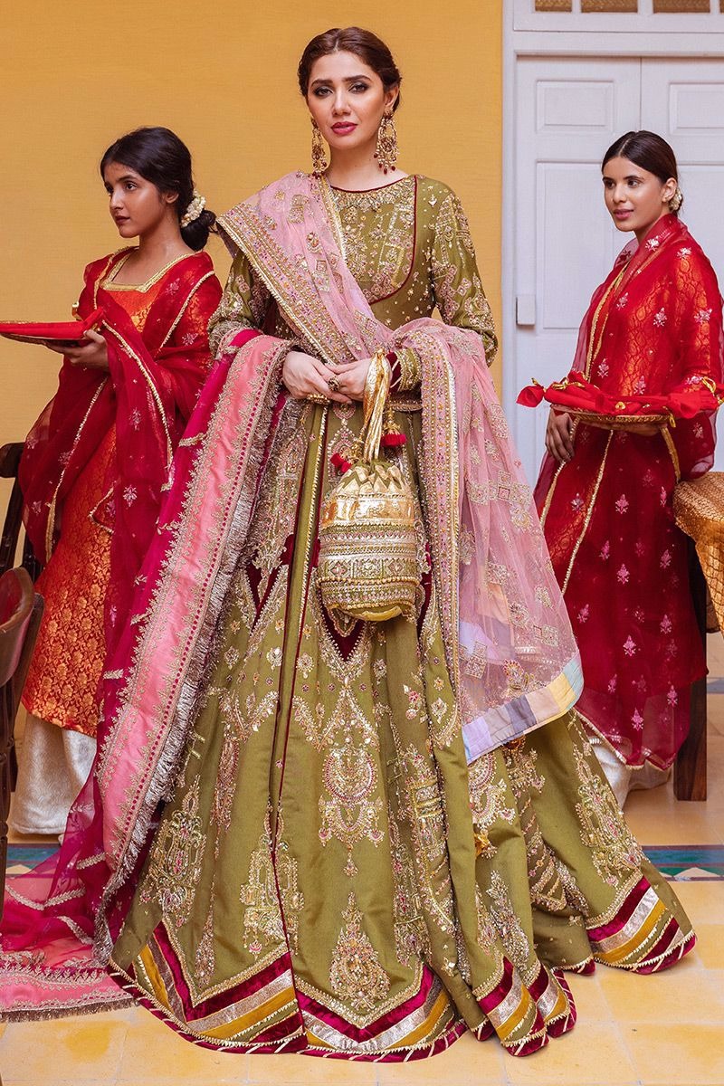 A graceful five-piece bridal ensemble featuring a moss green silk peshwas, a voluminous lehnga, and vibrant layered dupattas that add depth, color, and celebratory elegance.