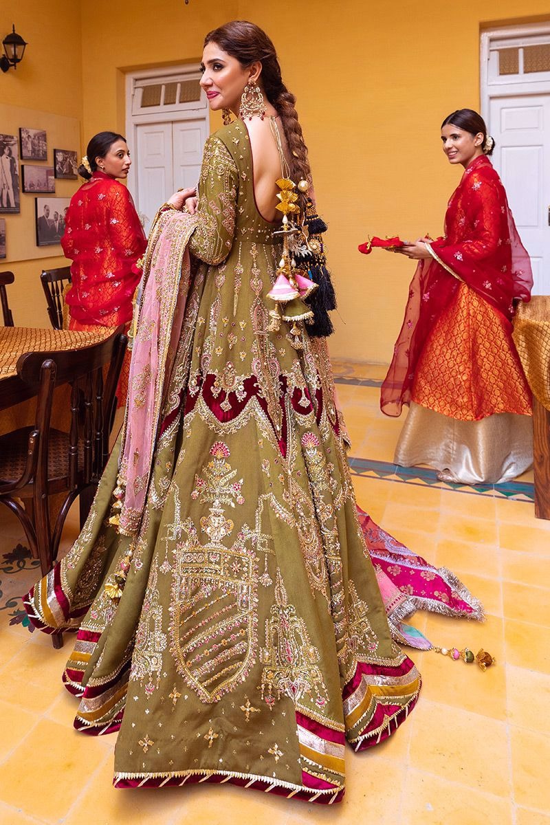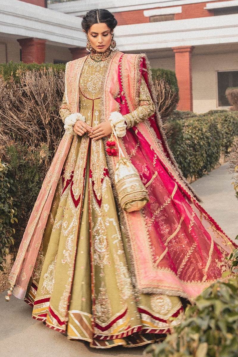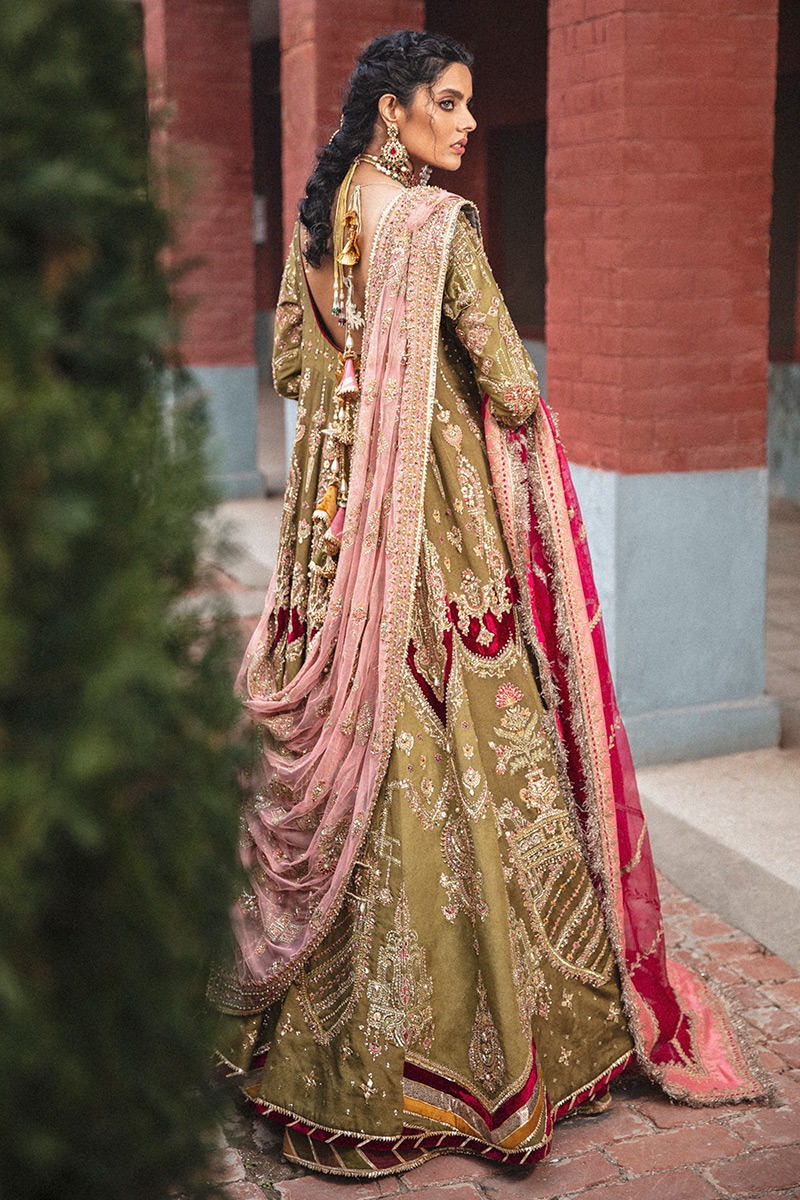 The peshwas is crafted from pure silk in a serene moss green shade. Designed with a classic flowing silhouette, it reflects timeless bridal elegance while allowing the richness of the fabric and hand detailing to take center stage.